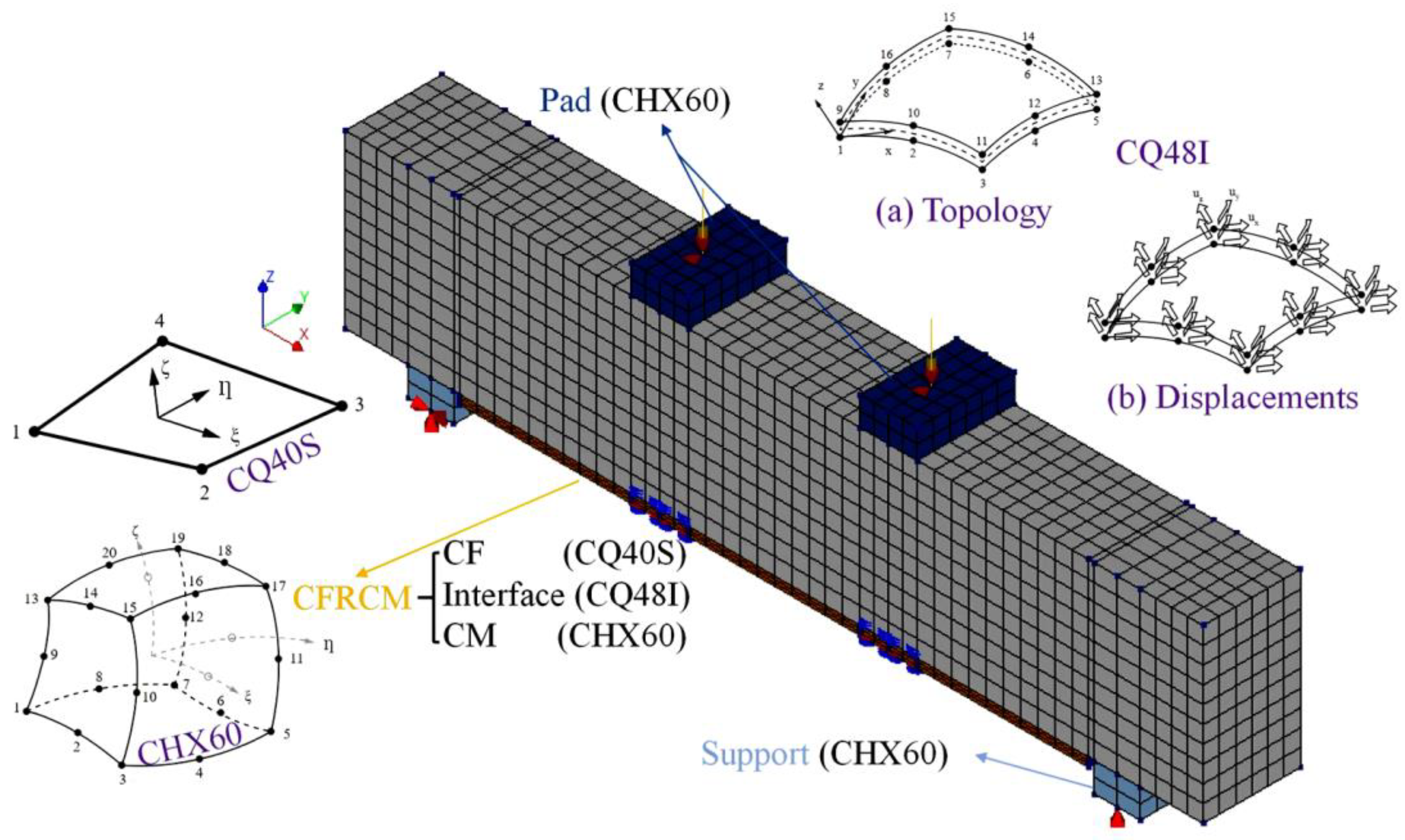 - The CFRCM strengthening system applied in sagging-moment regions effectively improves the flexural performance of RC beams. The developed FEMs successfully reproduced the load–displacement responses, ultimate capacities, and failure modes, demonstrating its reliability for evaluating CFRCM-strengthened members. Extension of the present experimental and numerical framework to continuous RC beams, particularly in hogging-moment regions, as well as to members subjected to combined flexure–shear actions, represents a logical direction for future research.