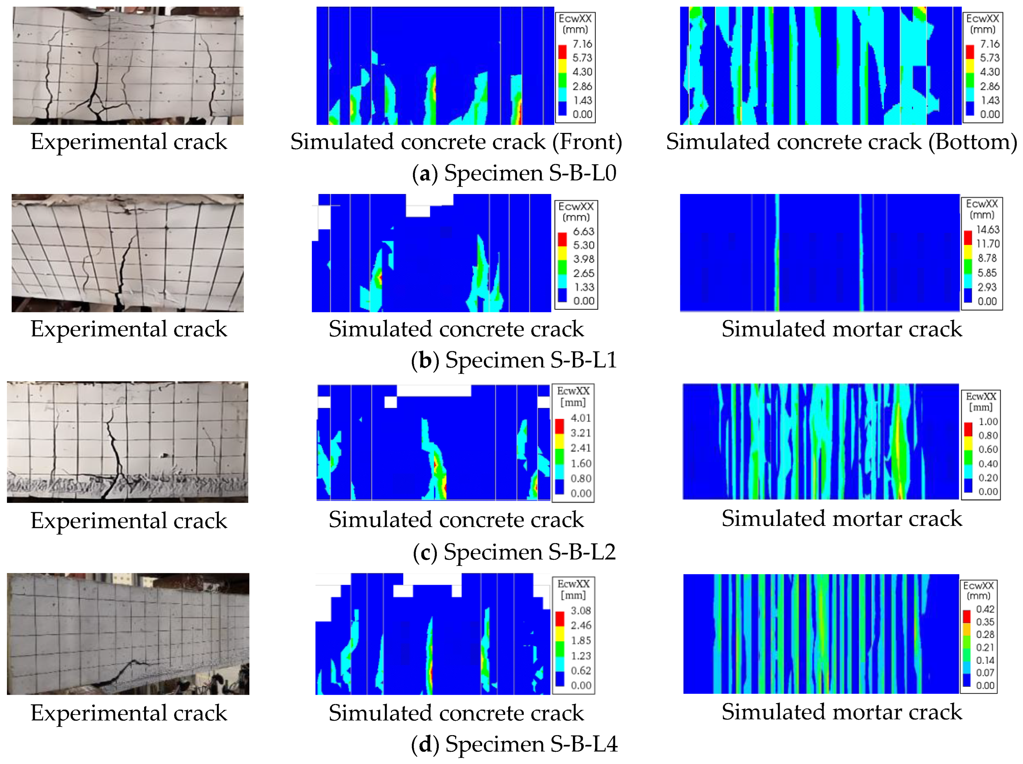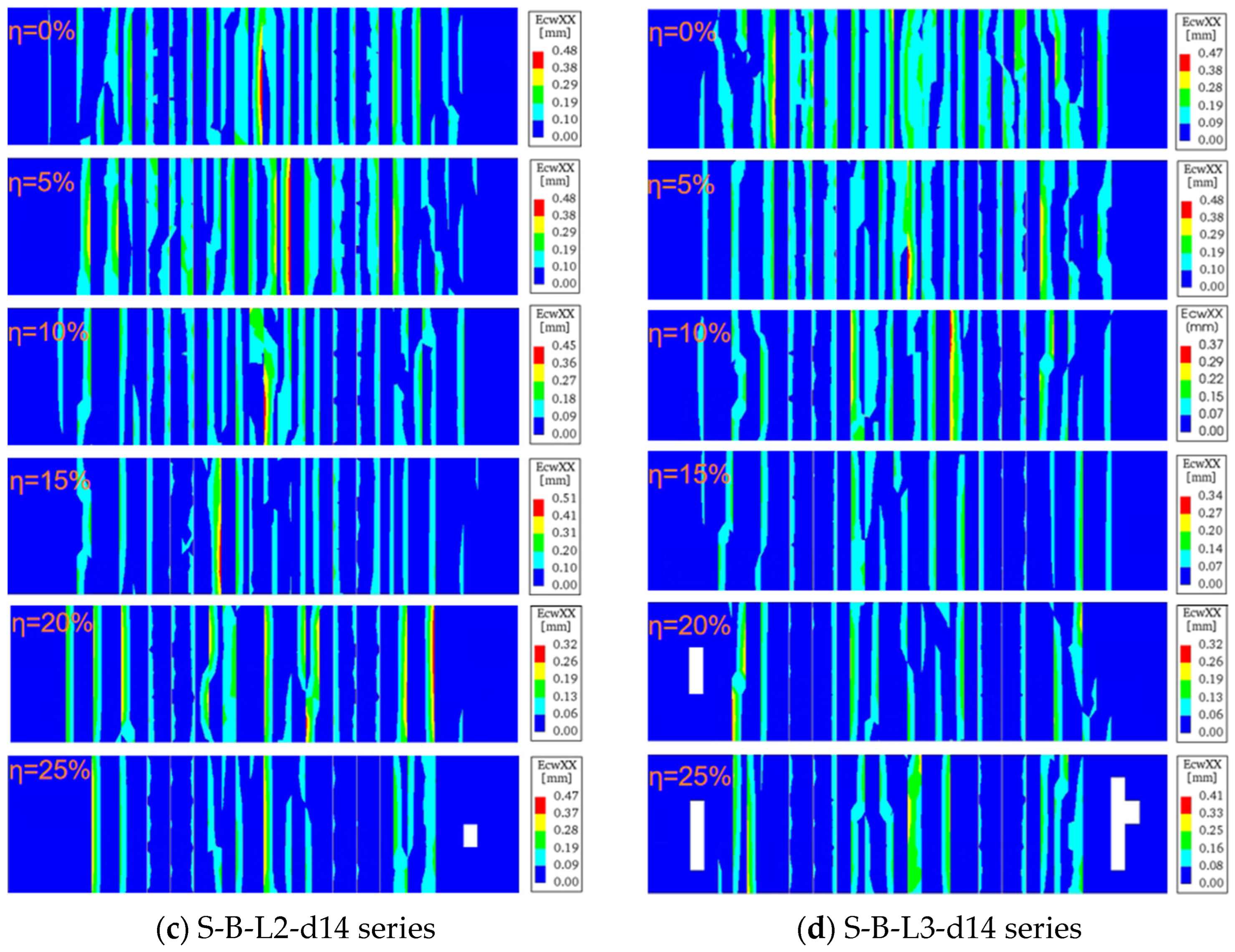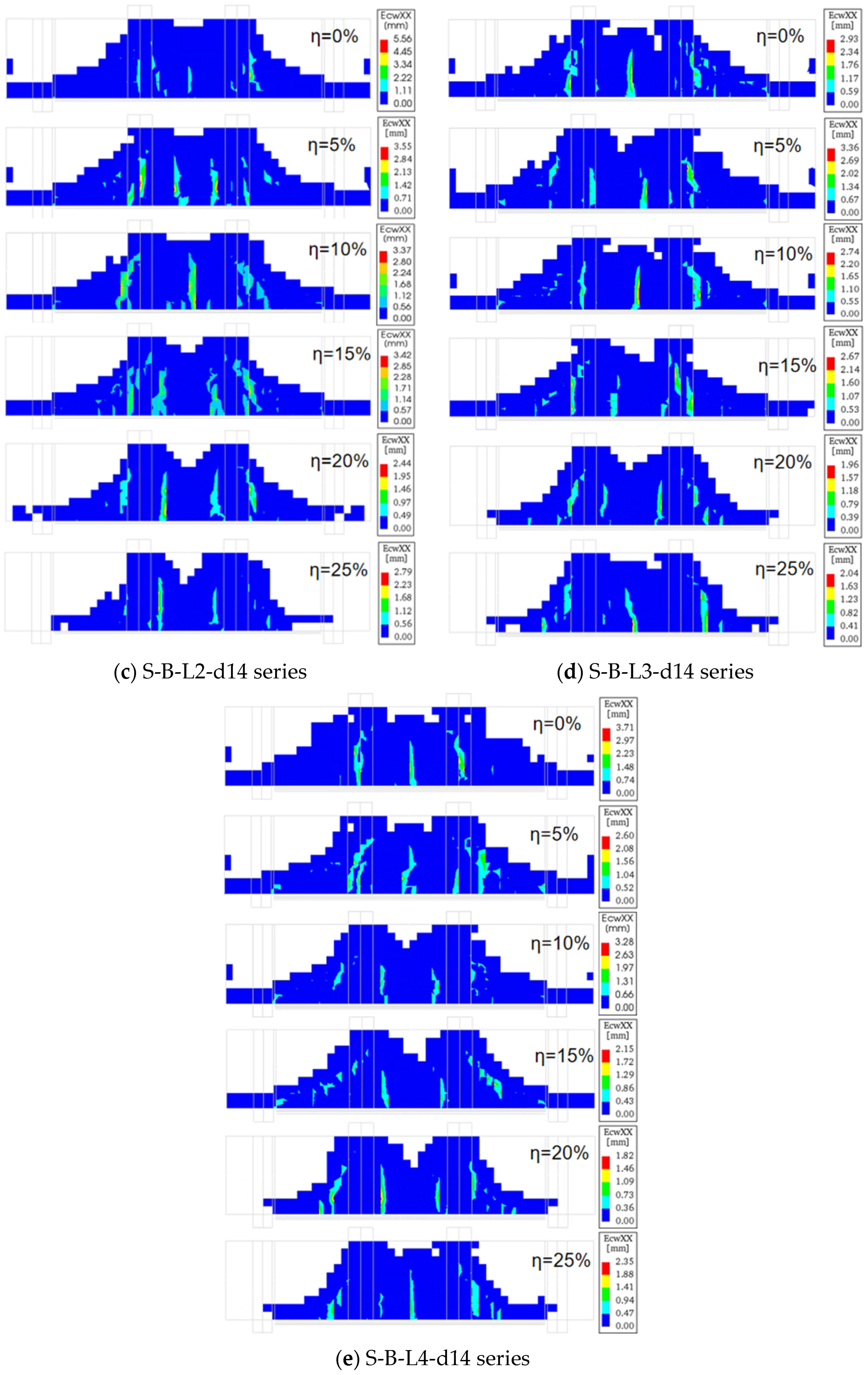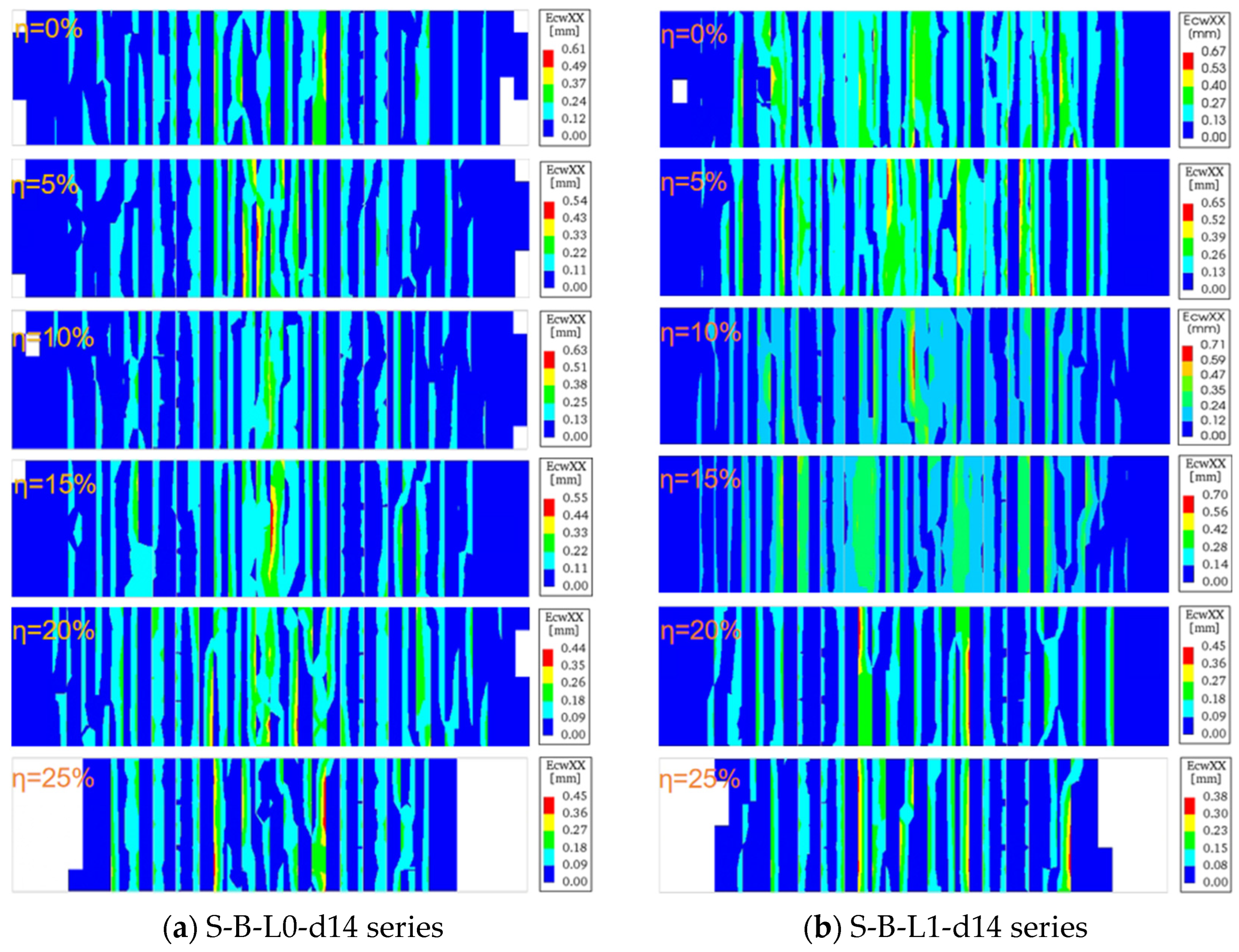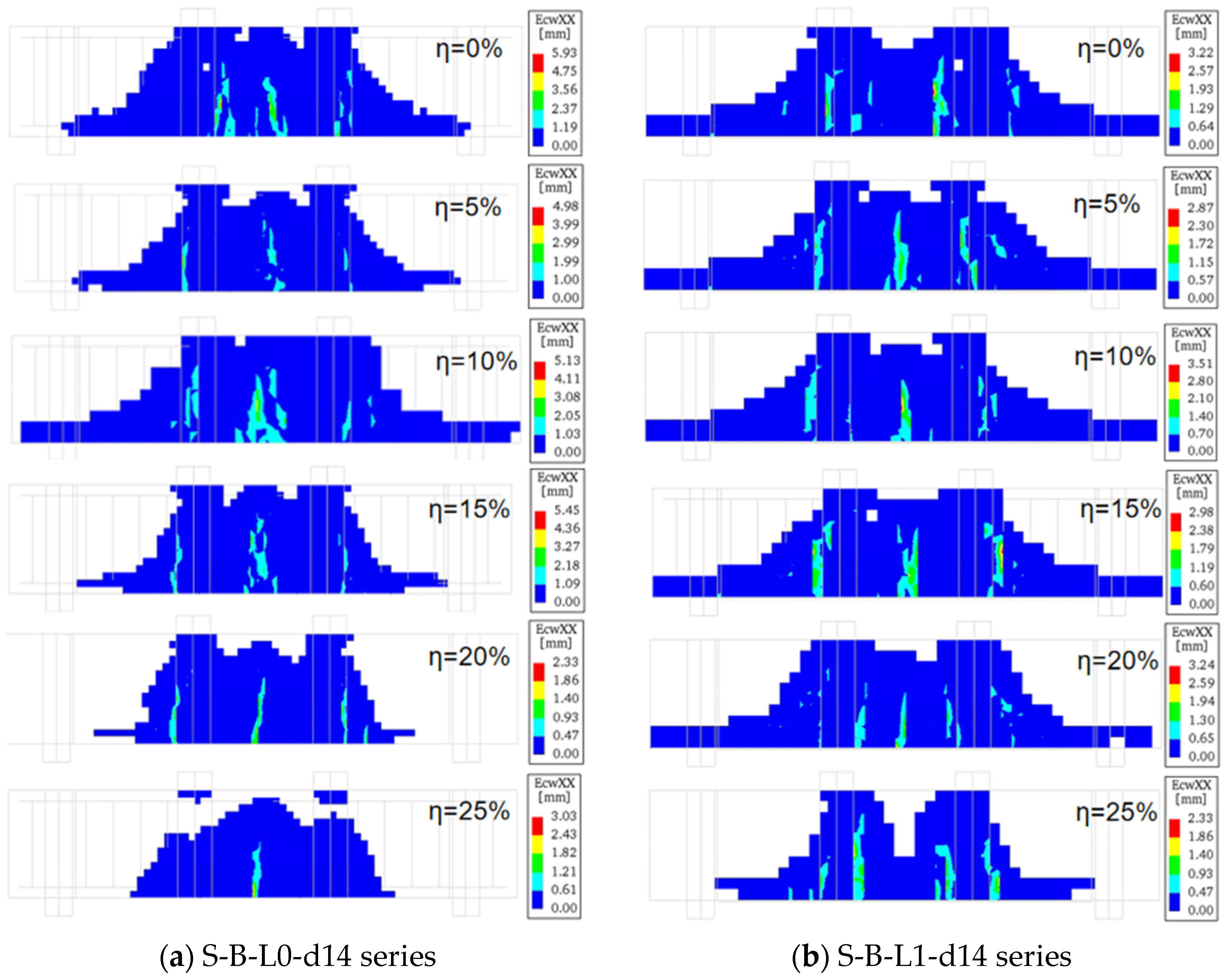 - Corrosion rate and CFRCM layers jointly govern the failure mode. At a corrosion level of 15%, specimens strengthened with three or four CFRCM layers (L3-L4) exhibited insufficient shear resistance and developed an increased number of flexural-shear cracks.