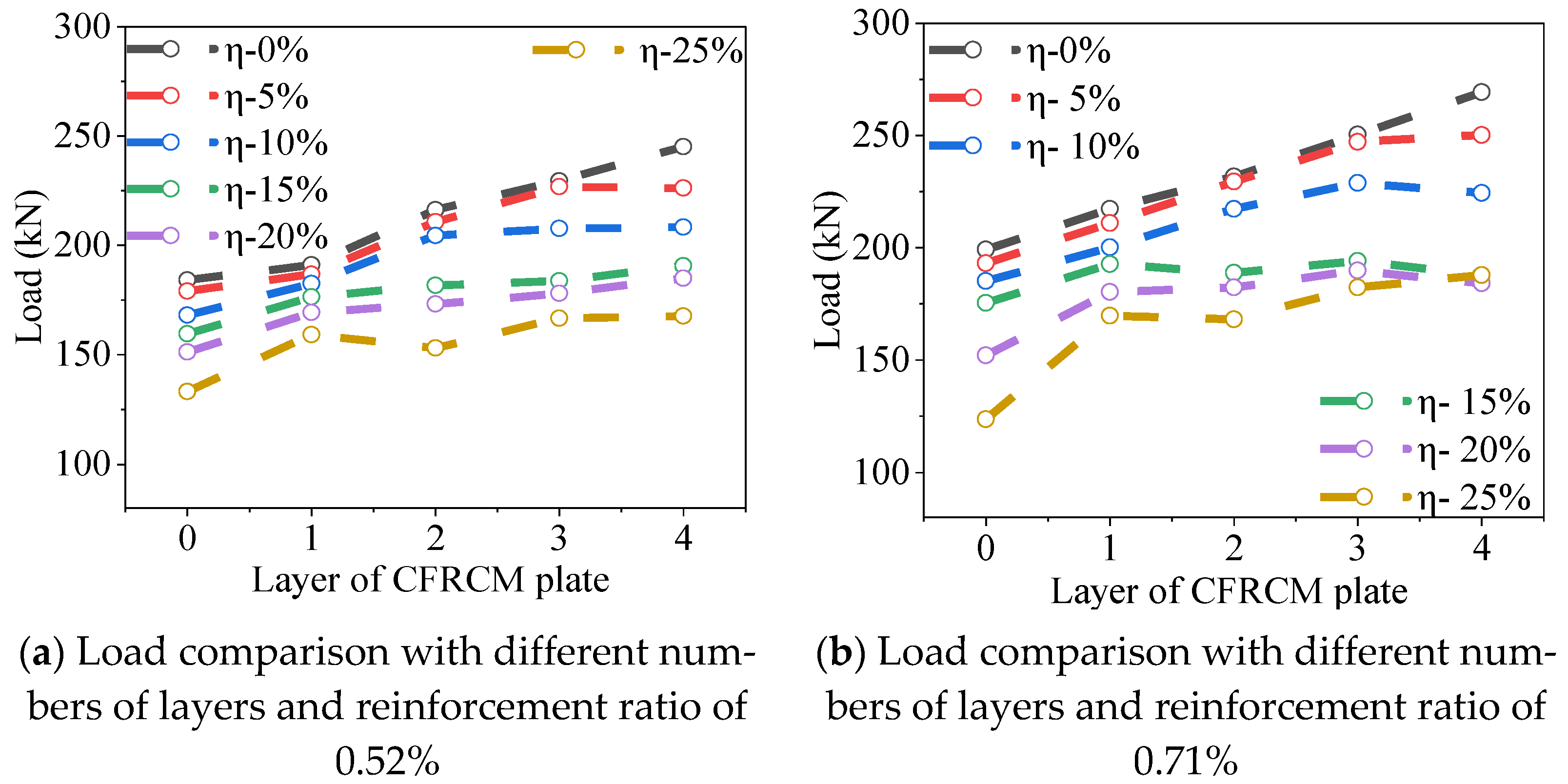 - The number of CFRCM layers significantly influences flexural performance. A two-layer configuration provides an efficient and balanced strengthening effect, whereas additional layers yield diminishing returns due to saturation, particularly under high corrosion levels or with larger reinforcement ratios.