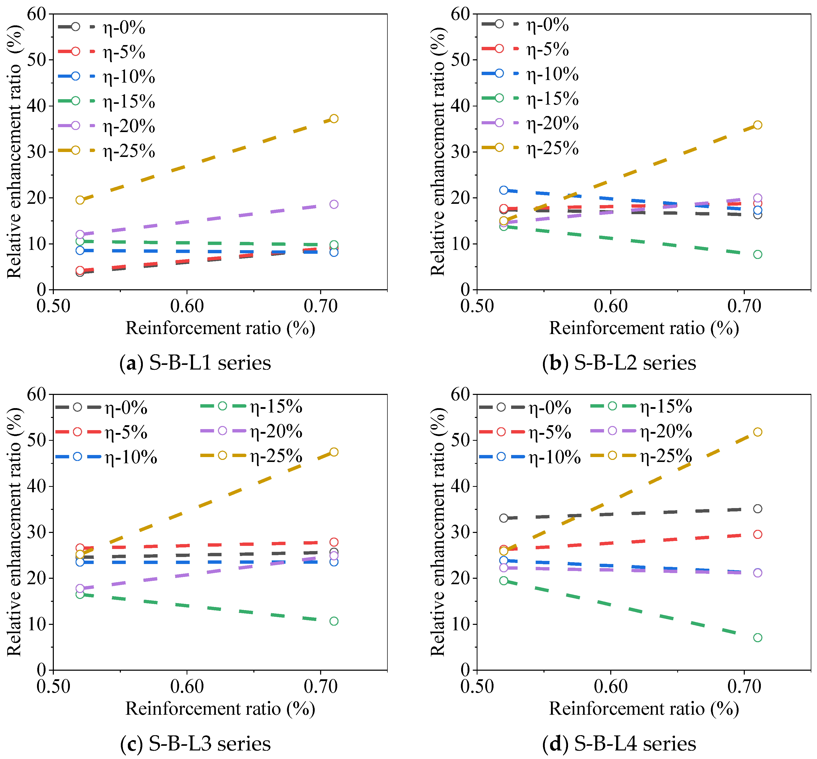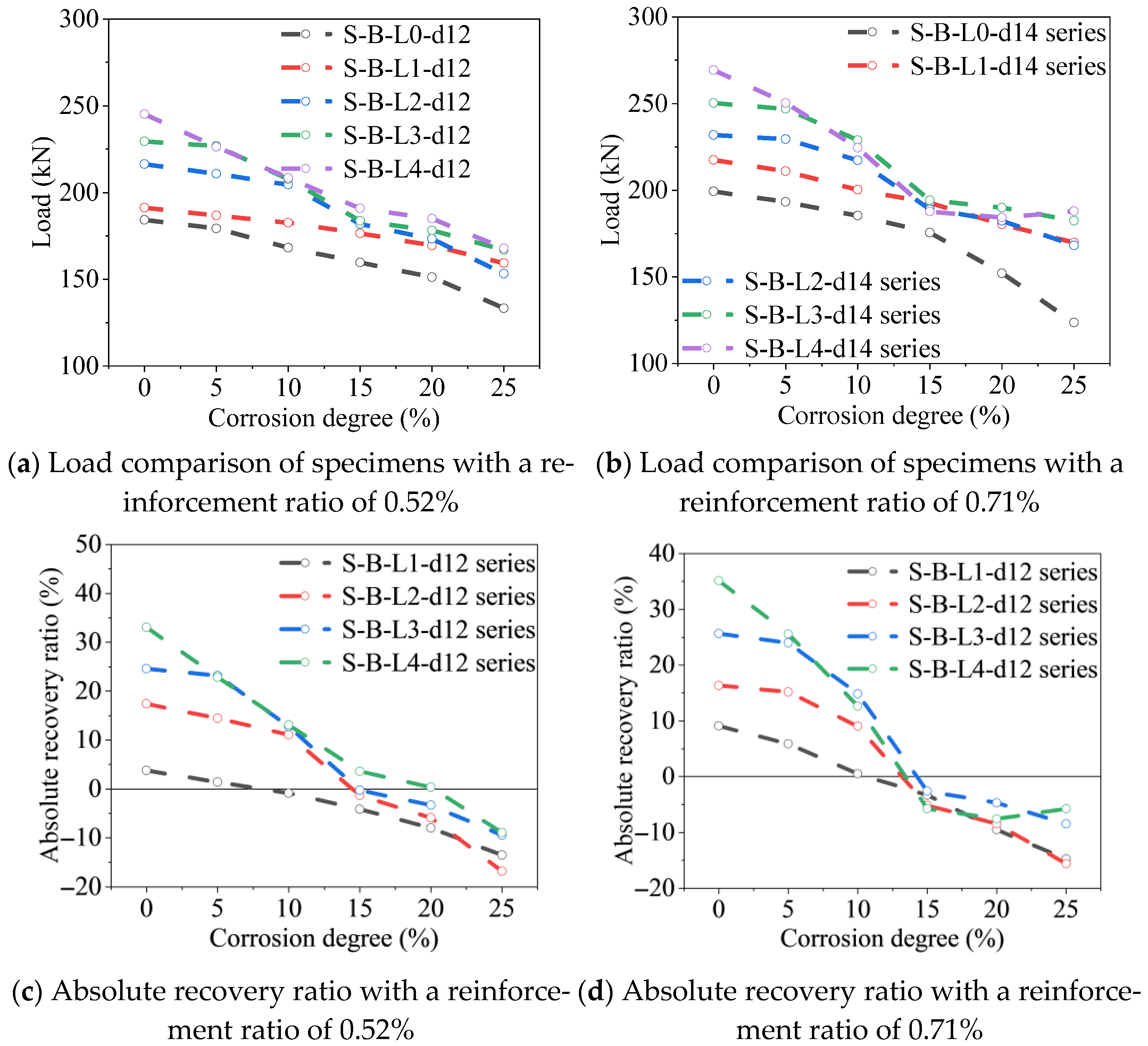 - The corrosion rate of steel rebar is the decisive factor for strengthening effectiveness. Full recovery of the original load capacity is only achievable when corrosion remains below a critical threshold of 15%; beyond this level, the baseline capacity cannot be restored. It should be noted that the corrosion levels considered herein represent equivalent uniform corrosion states calibrated from laboratory data.