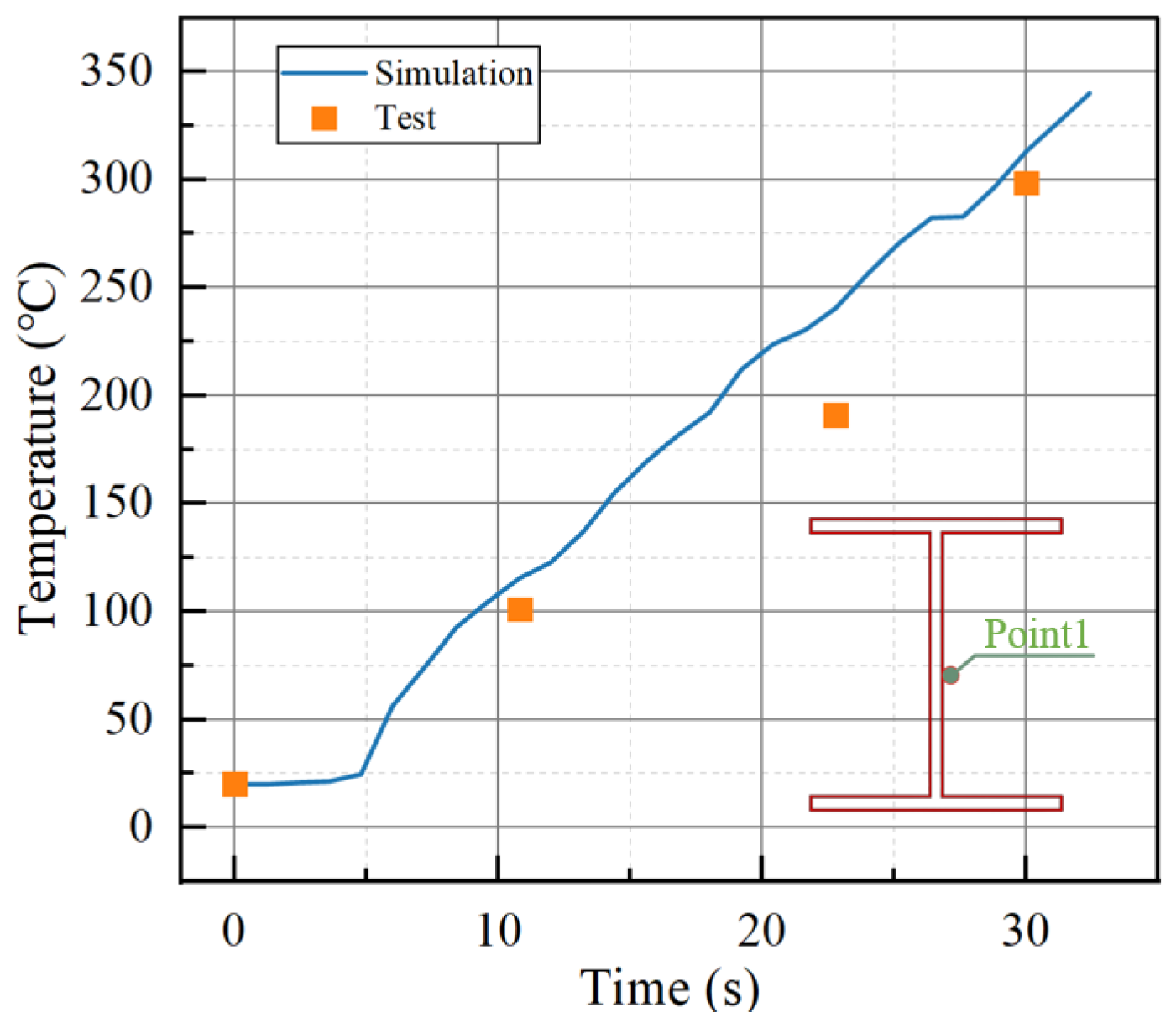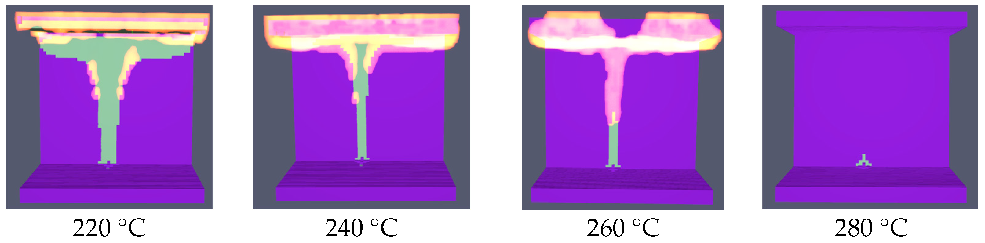 - Ignition Temperature: Four simulation nodes were uniformly defined within the range of 220 °C to 280 °C. Thermal conductivity and specific heat capacity were held constant at 0.10 W/(m·K) and 1.1 kJ/(kg·K), respectively.
