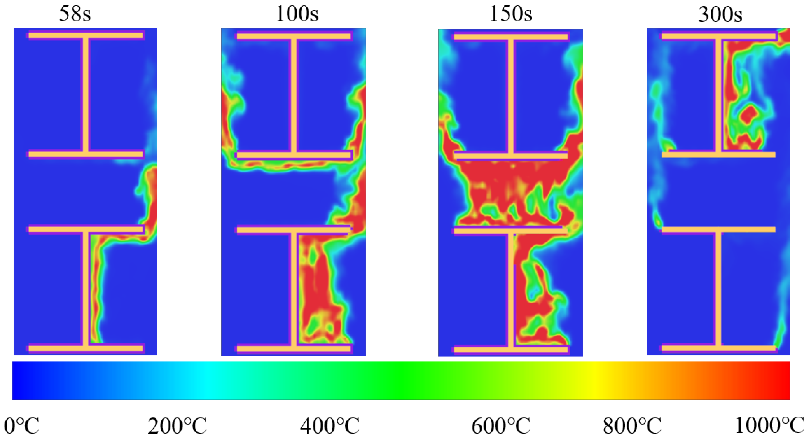 - A robust coupled FDS–ABAQUS simulation strategy was developed and validated. By integrating fire-driven fluid dynamics with radiative/convective heat transfer and three-dimensional solid conduction, this framework effectively bridges key multi-physics gaps in structural fire analysis. The strategy reliably predicts temperature-field evolution under fire exposure, as demonstrated through validation against standard fire-resistance tests. Furthermore, it shows good robustness across varying geometric scales, and the capability to capture coupled convection-radiation-conduction phenomena in confined spaces. Consequently, the proposed approach provides a reliable numerical tool for analyzing thermal responses in such structural systems.