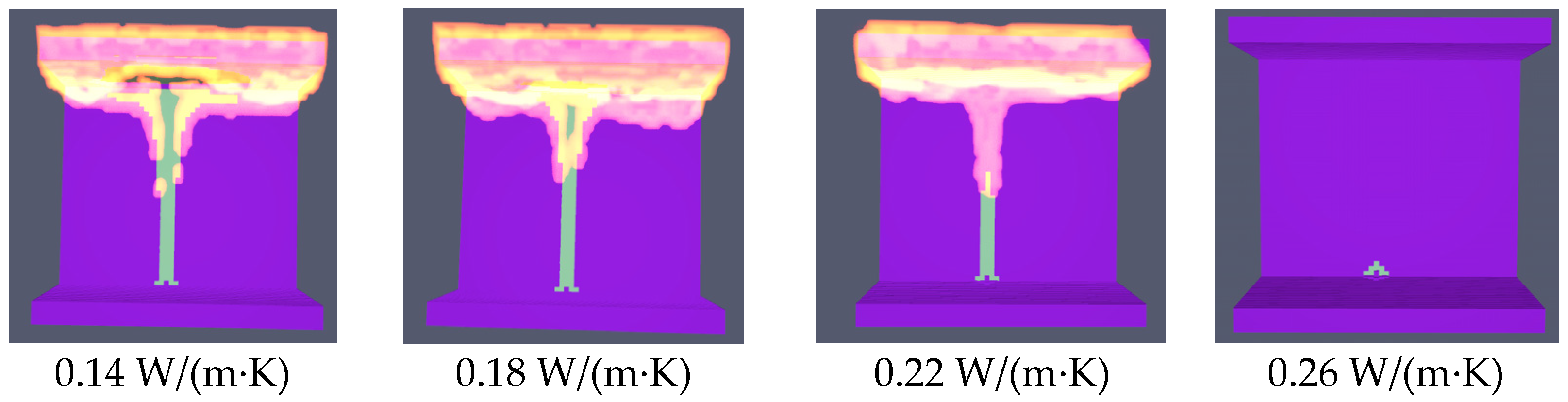 - Thermal Conductivity: Five simulation nodes were uniformly distributed within the range of 0.14 W/(m·K) to 0.26 W/(m·K). Ignition temperature and specific heat capacity were fixed at 280 °C and 1.1 kJ/(kg·K), respectively.