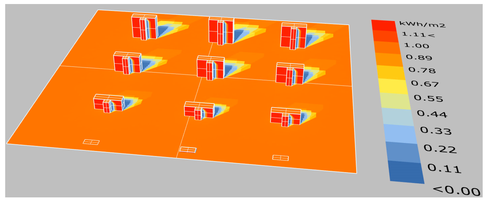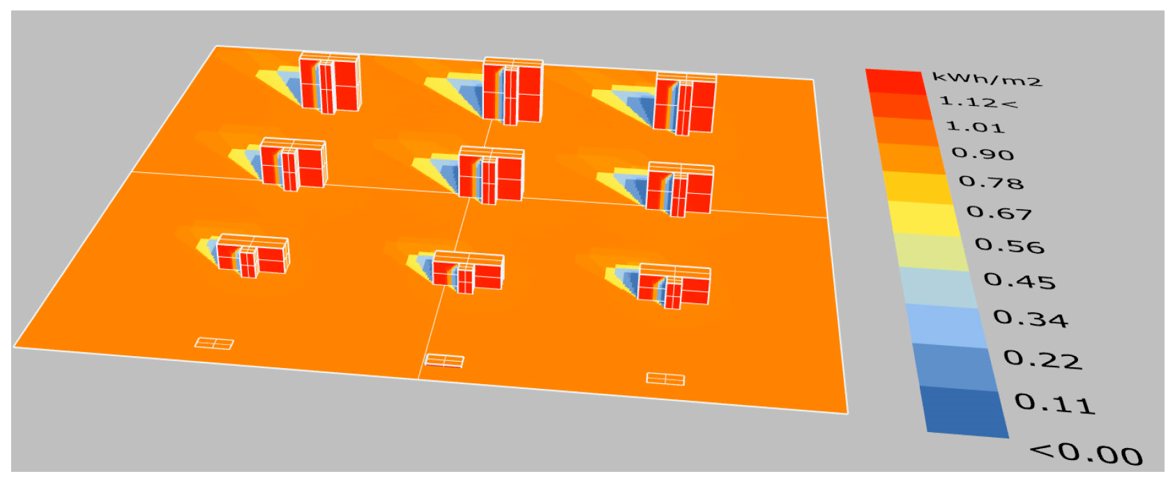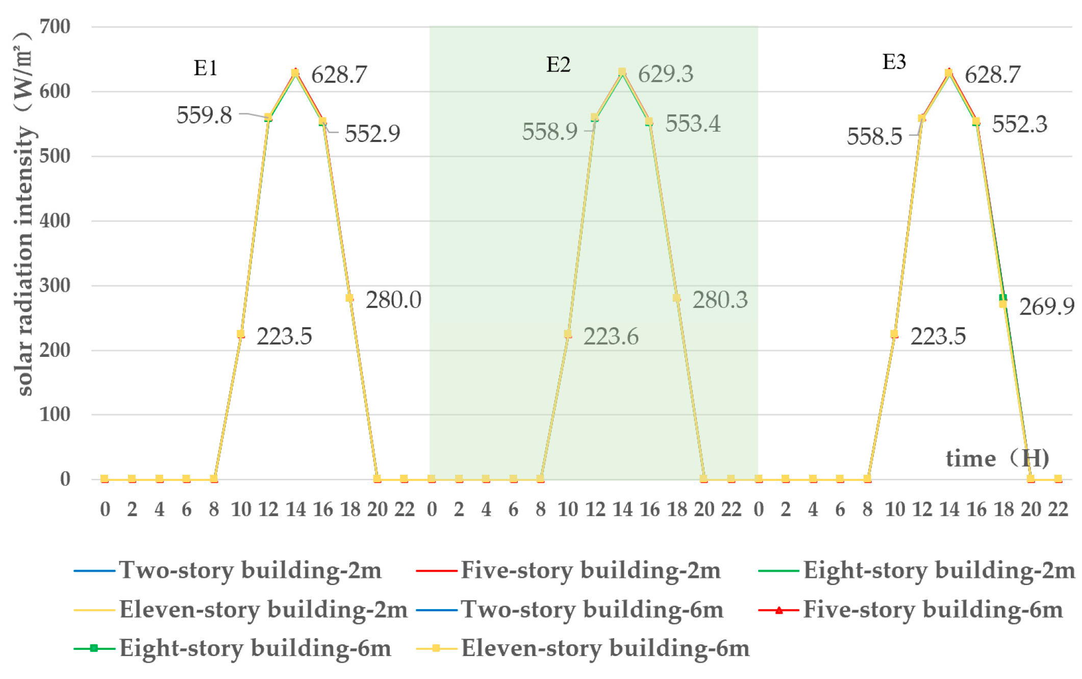 | Solar Radiation (W/m2) | Two-Story Building | Five-Story Building | Eight-Story Building | Eleven-Story Building | |||||