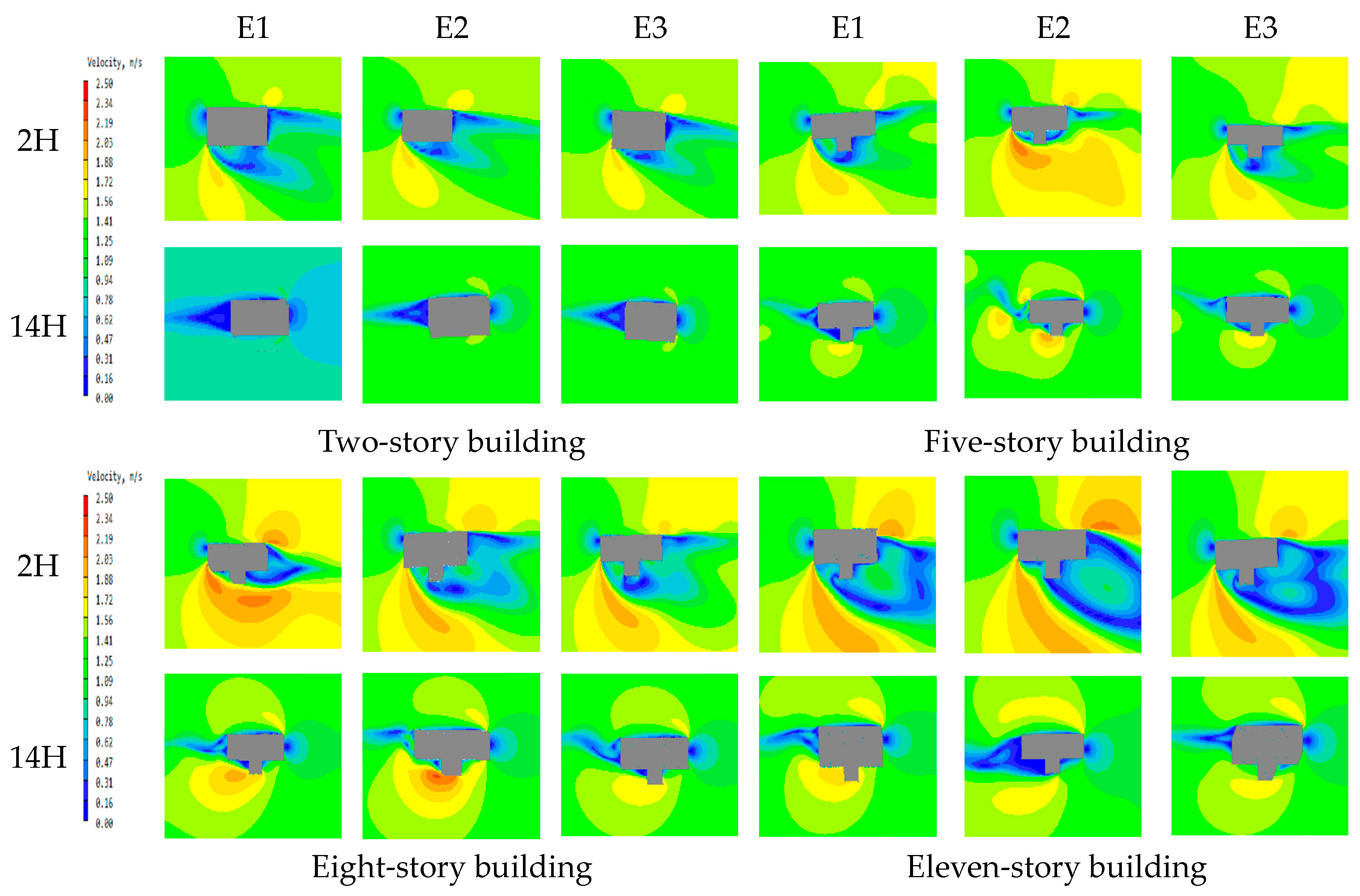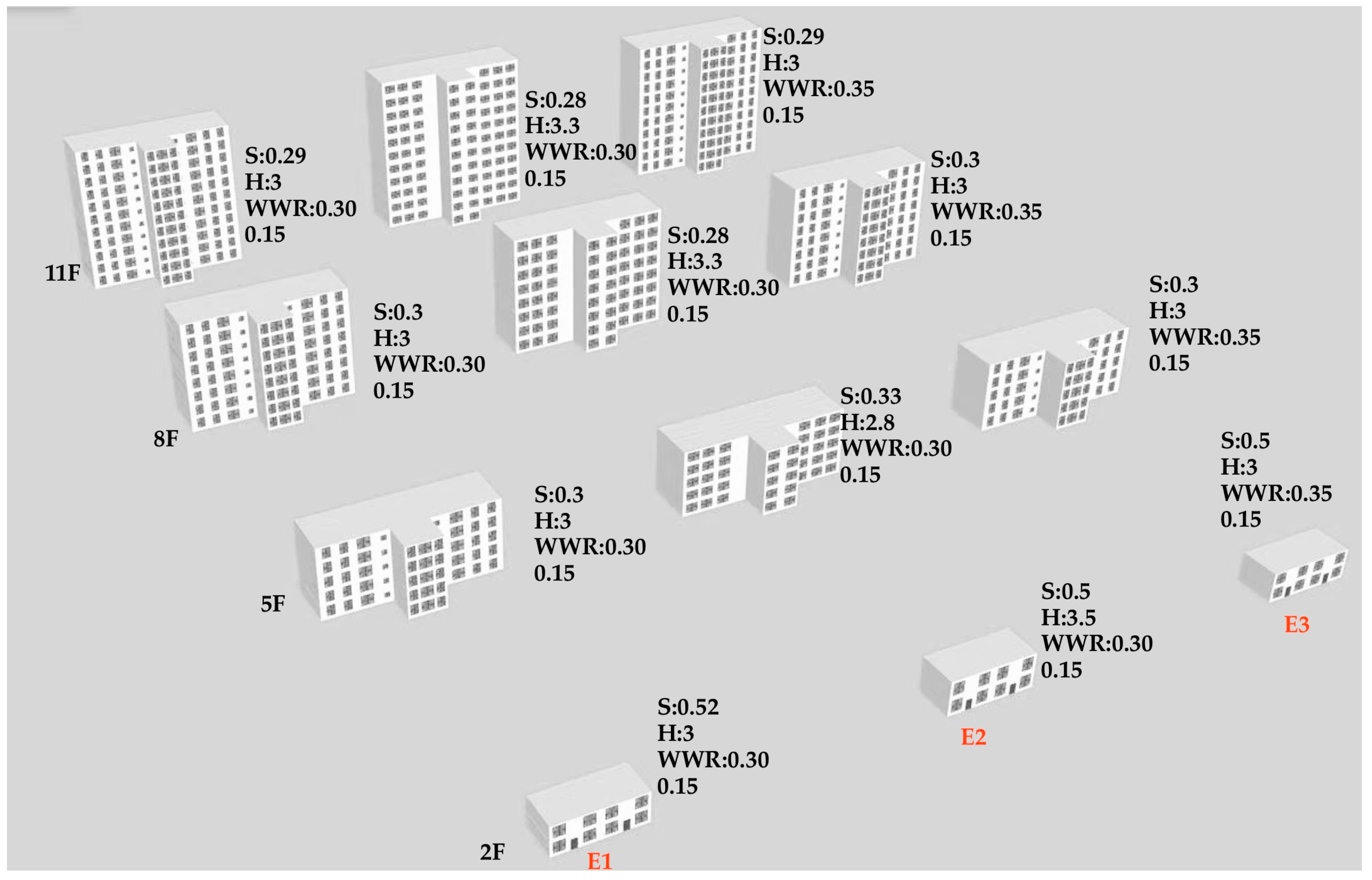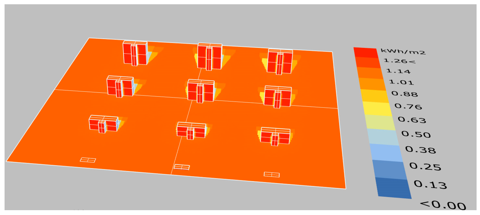 | Solar Radiation (W/m2) | Two-Story Building | Five-Story Building | Eight-Story Building | Eleven-Story Building | |||||
