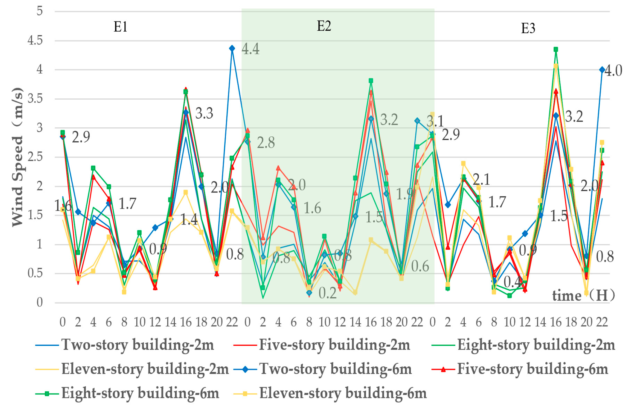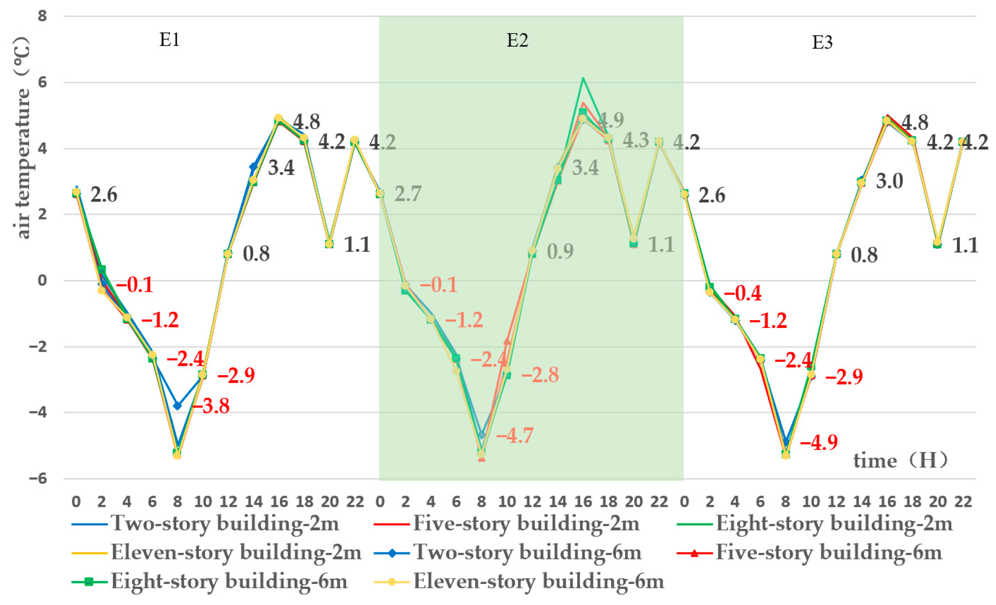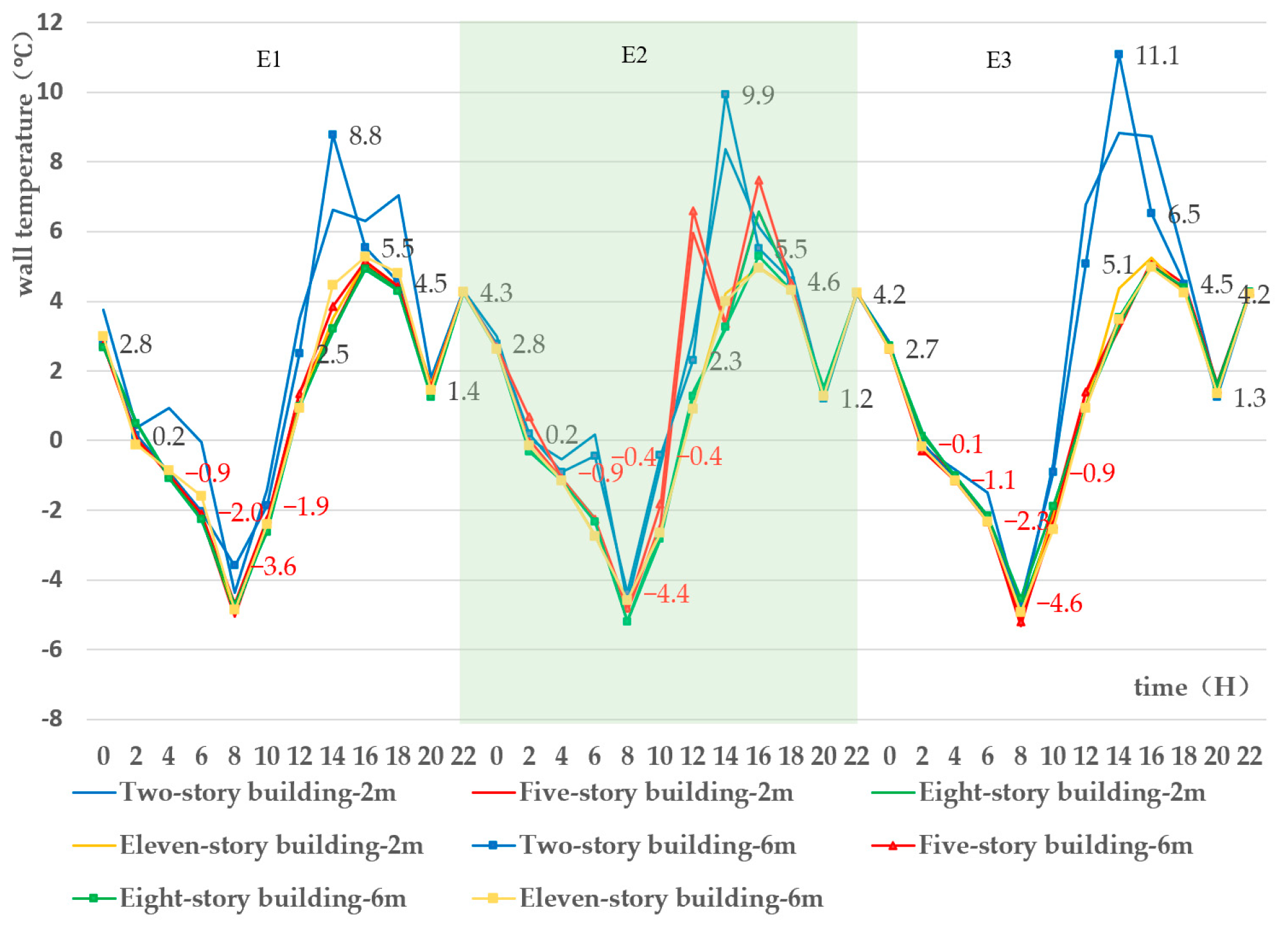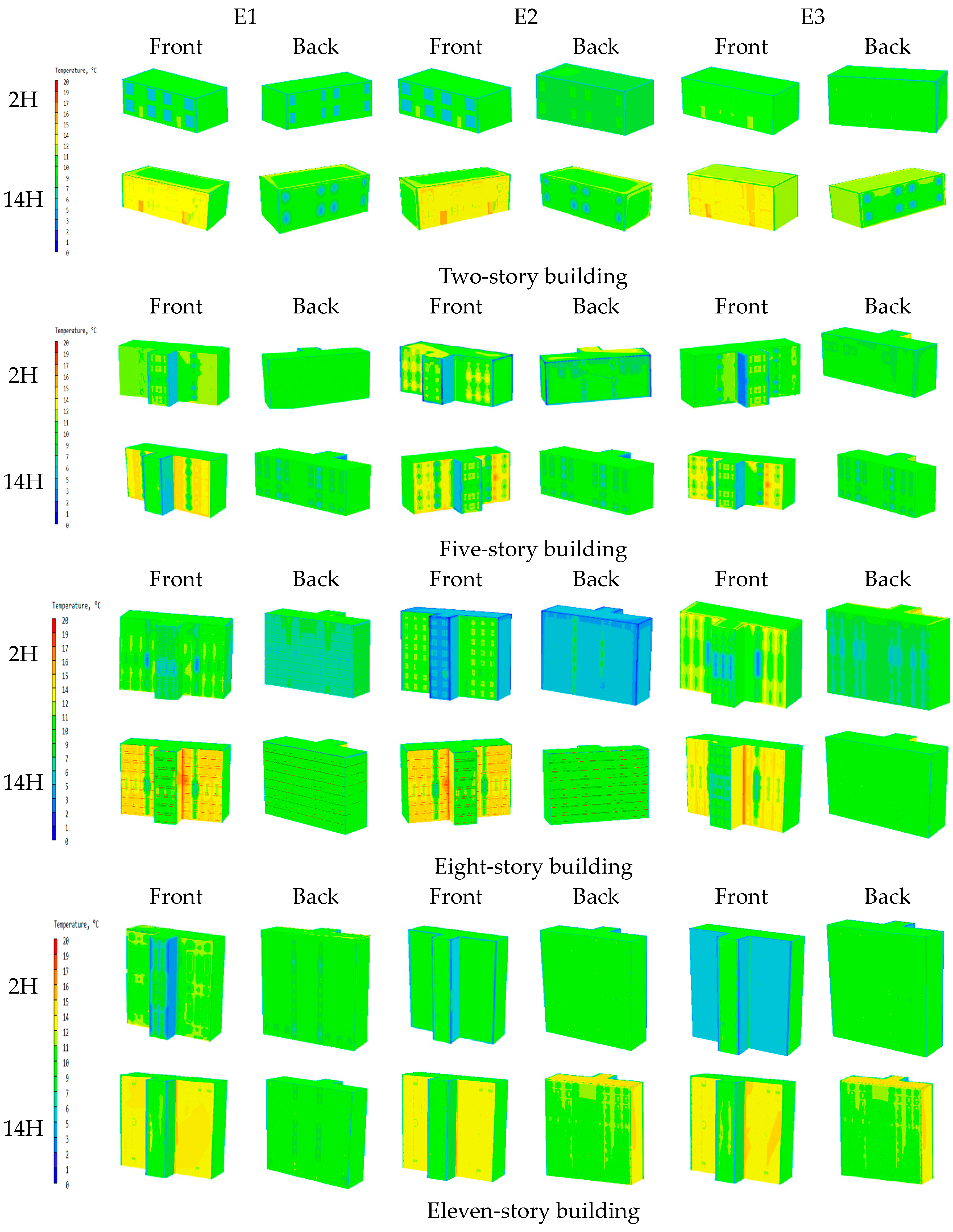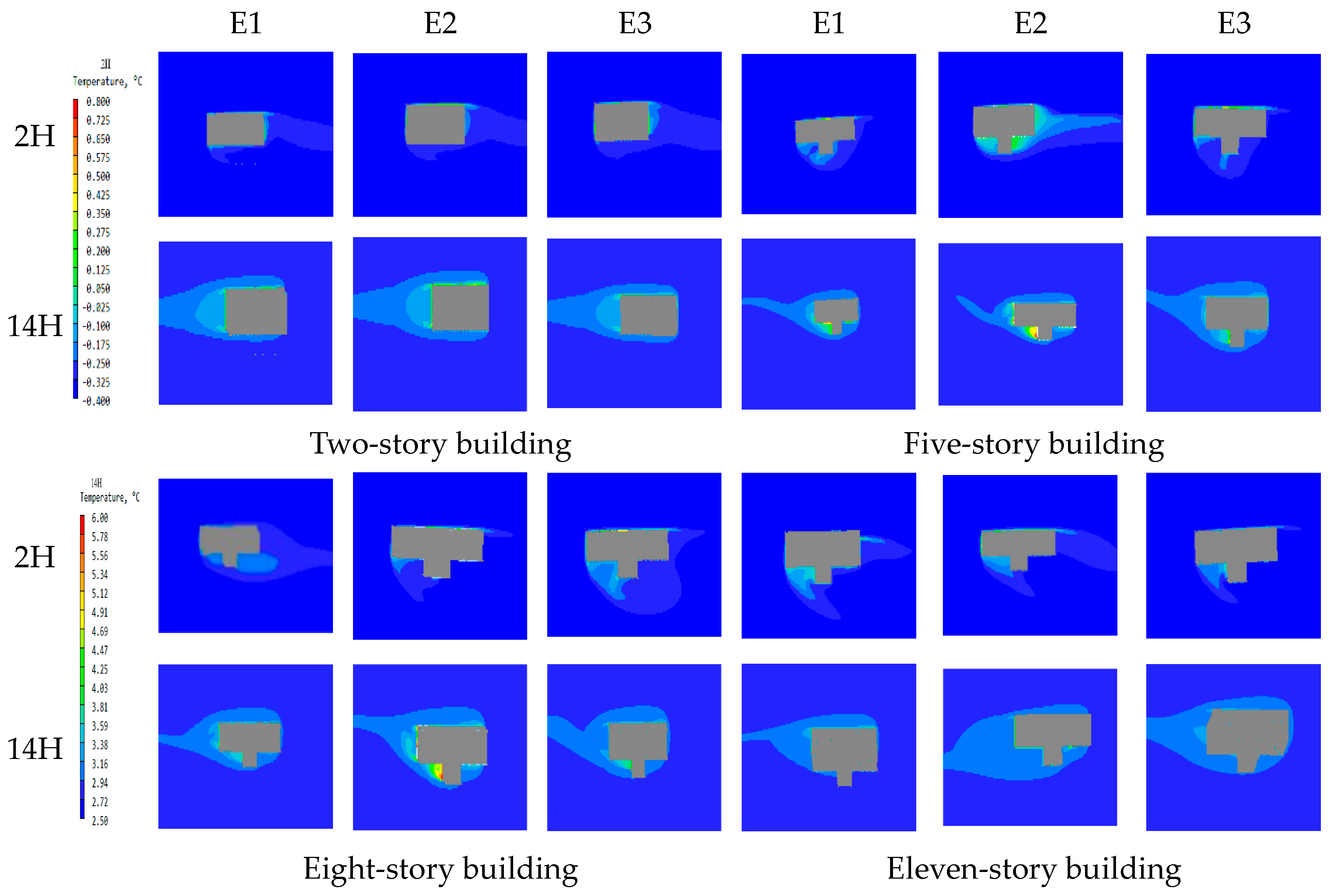 | Outside Wall Temperature (°C) | Two-Story Building | Five-Story Building | Eight-Story Building | Eleven-Story Building | |||||