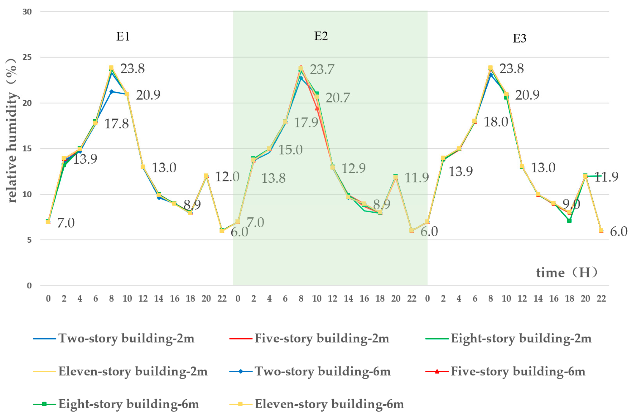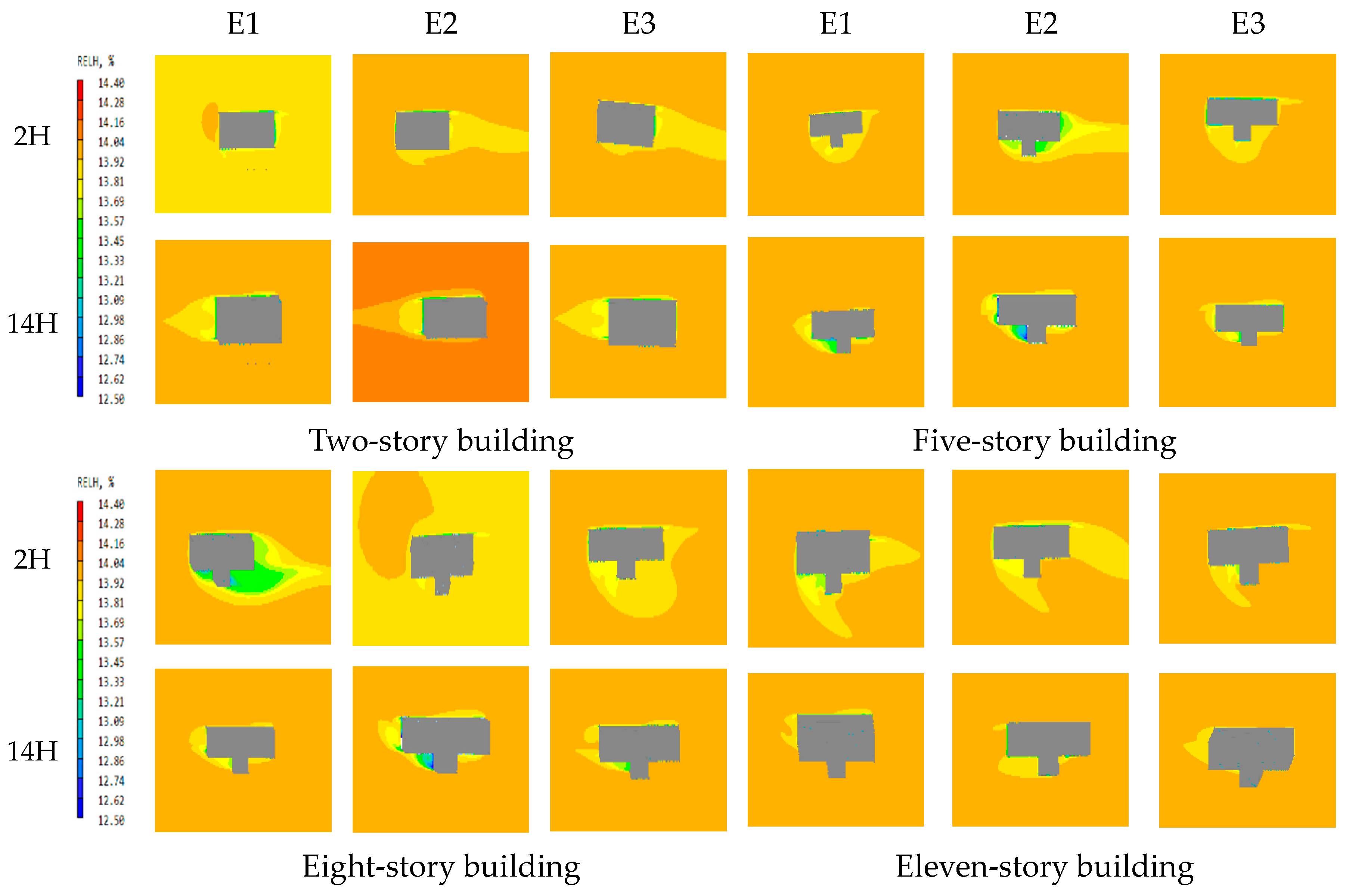 | Relative Humidity (%) | Two-Story Building | Five-Story Building | Eight-Story Building | Eleven-Story Building | |||||