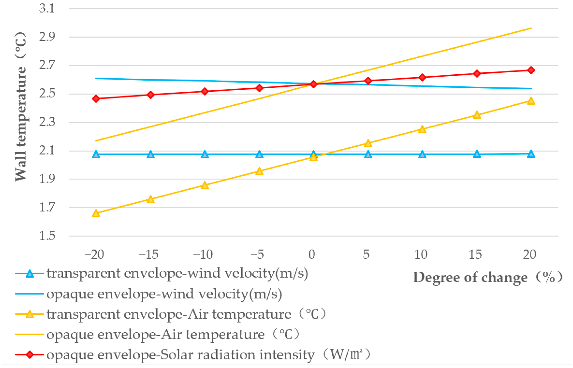 | Degree of change (%) | wind velocity | Outside Wall temperature | Solar radiation intensity | Outside Wall temperature | Air temperature | Outside Wall temperature | ||