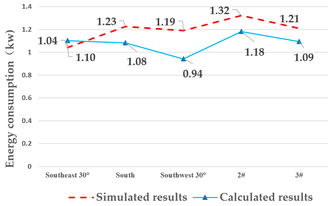 | Energy Consumption (kw) | Southeast 30° | South | Southwest 30° | 2# | 3# |