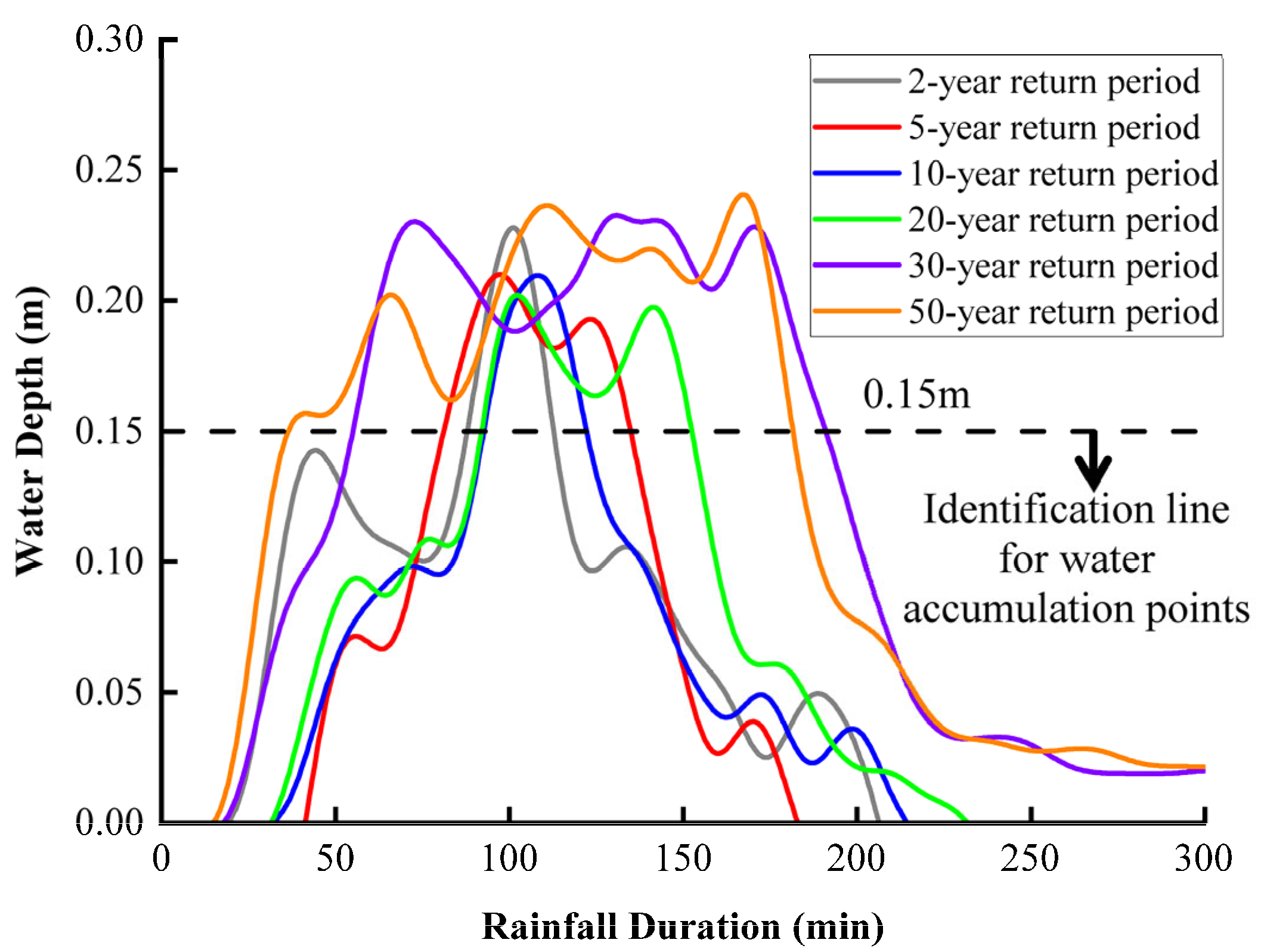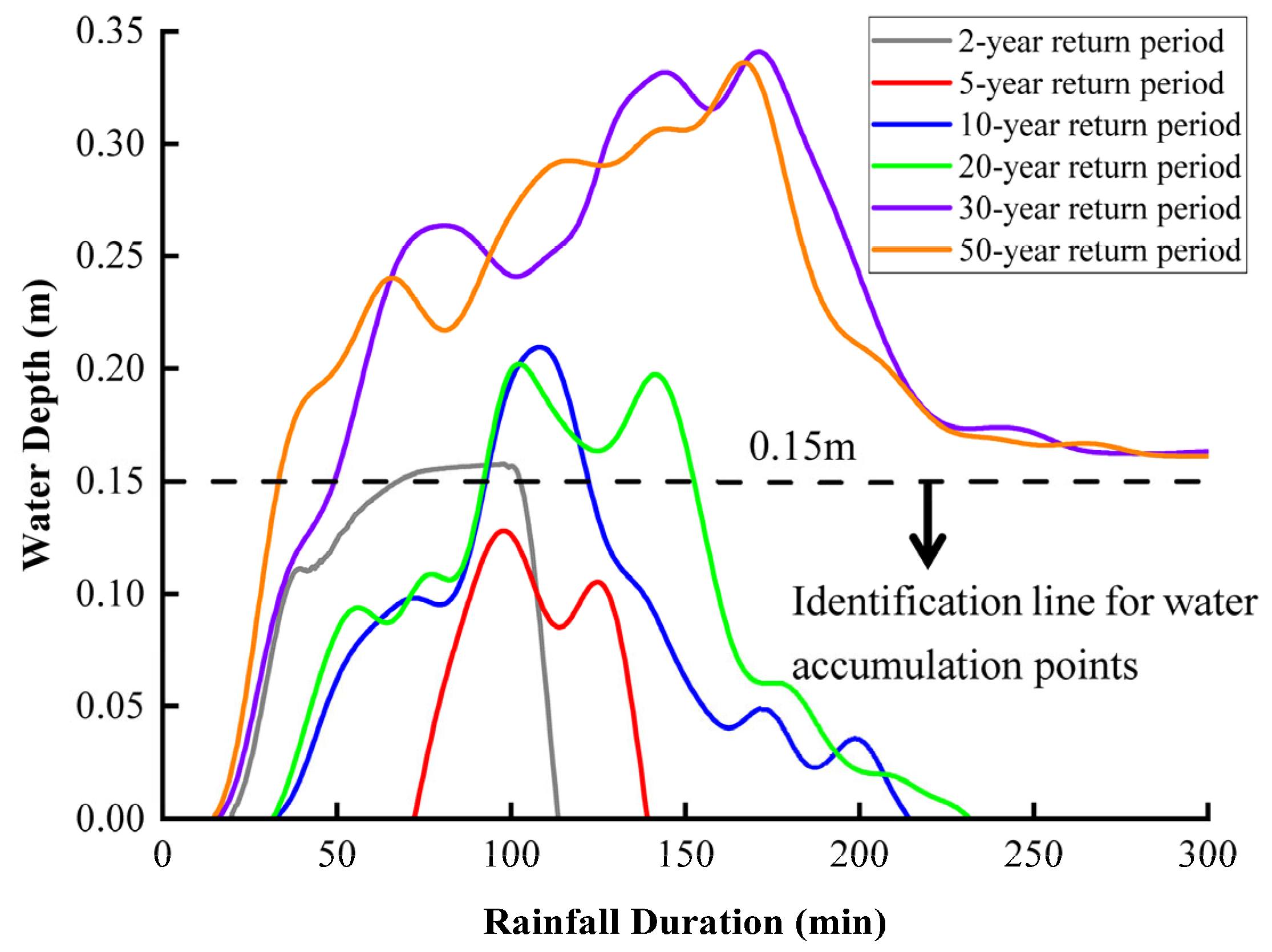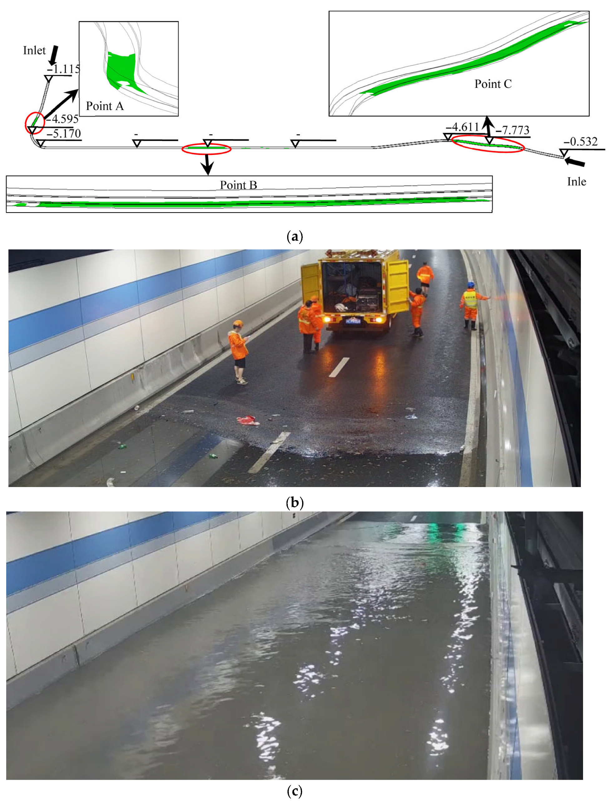 - Two distinct flooding patterns were identified: a systemic response at the tunnel’s lowest point (Point B) and a localized response at the entrance concavity (Point C). While water depth at Point B is strongly correlated with total inflow volume, the accumulation at Point C is governed and eventually capped by local micro-topography.