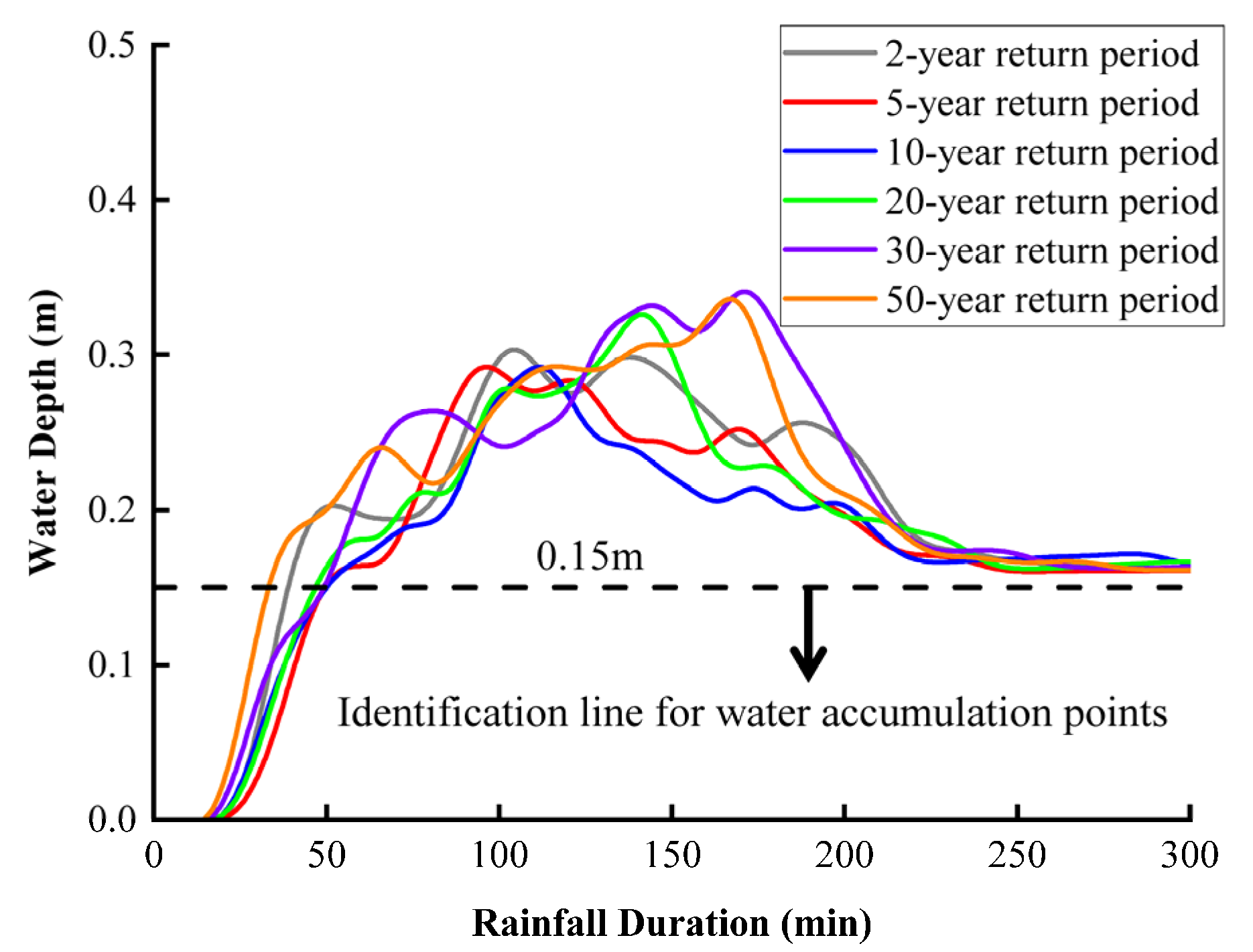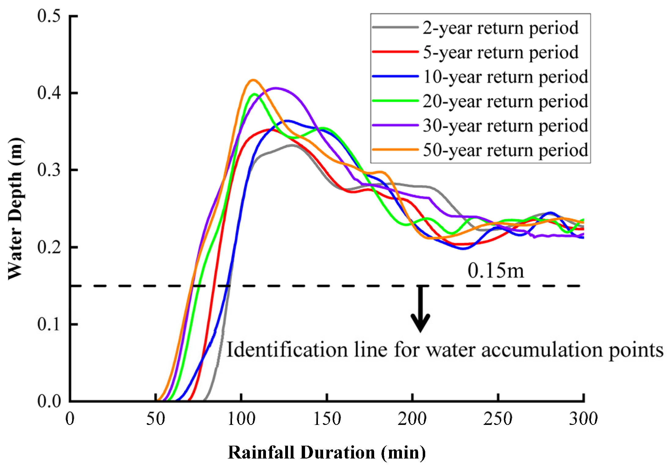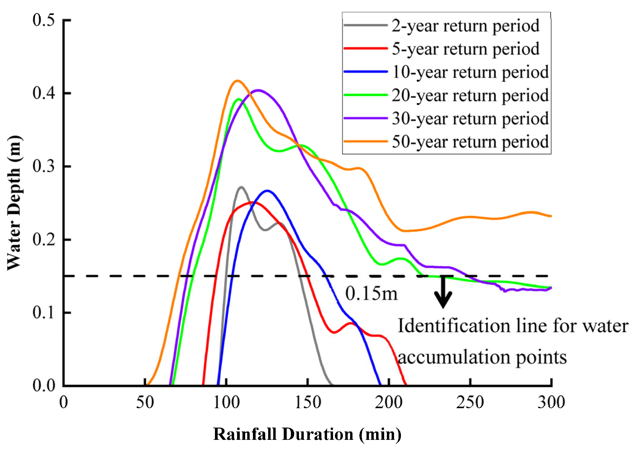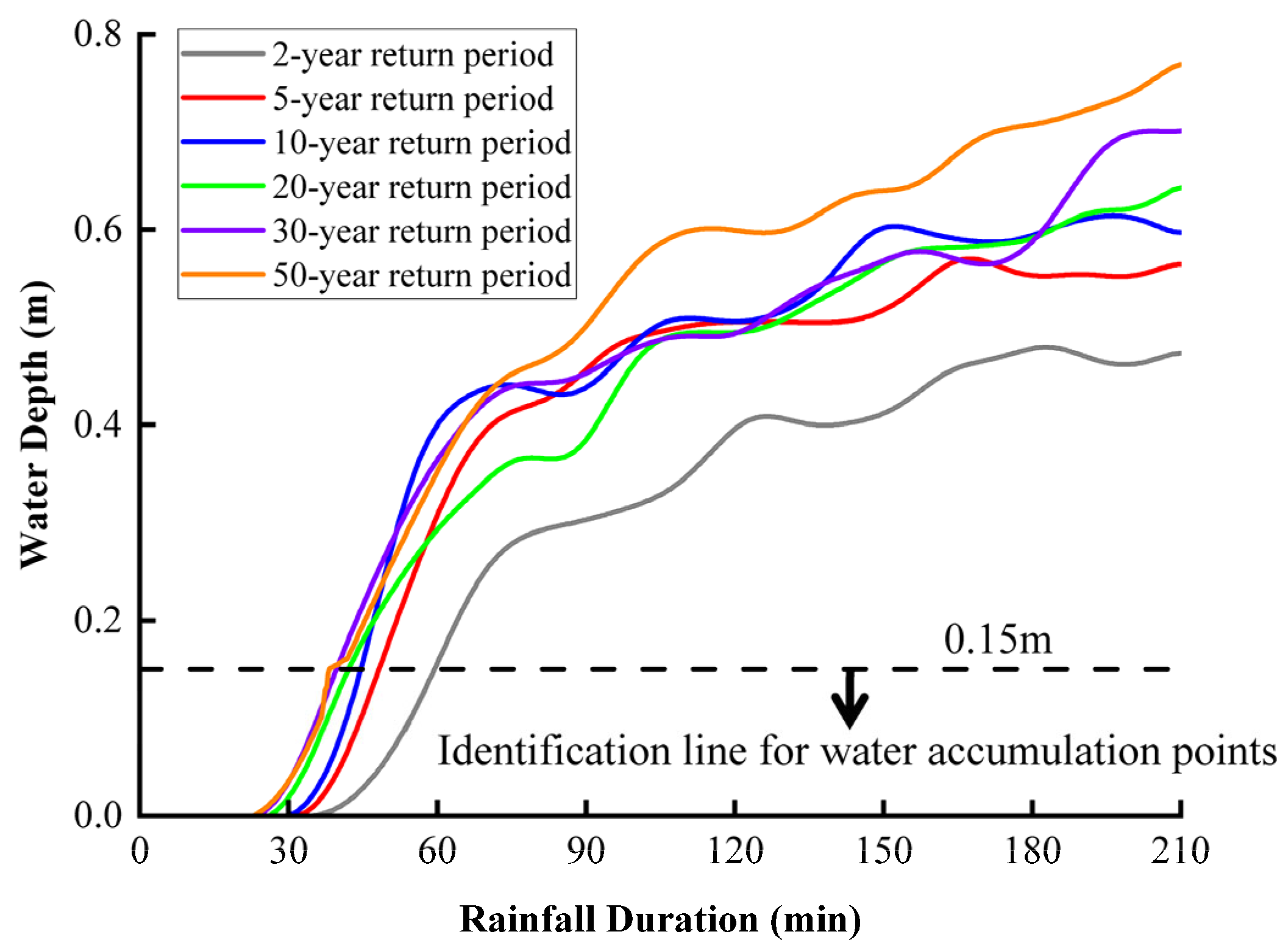 - Two distinct flooding patterns were identified: a systemic response at the tunnel’s lowest point (Point B) and a localized response at the entrance concavity (Point C). While water depth at Point B is strongly correlated with total inflow volume, the accumulation at Point C is governed and eventually capped by local micro-topography.