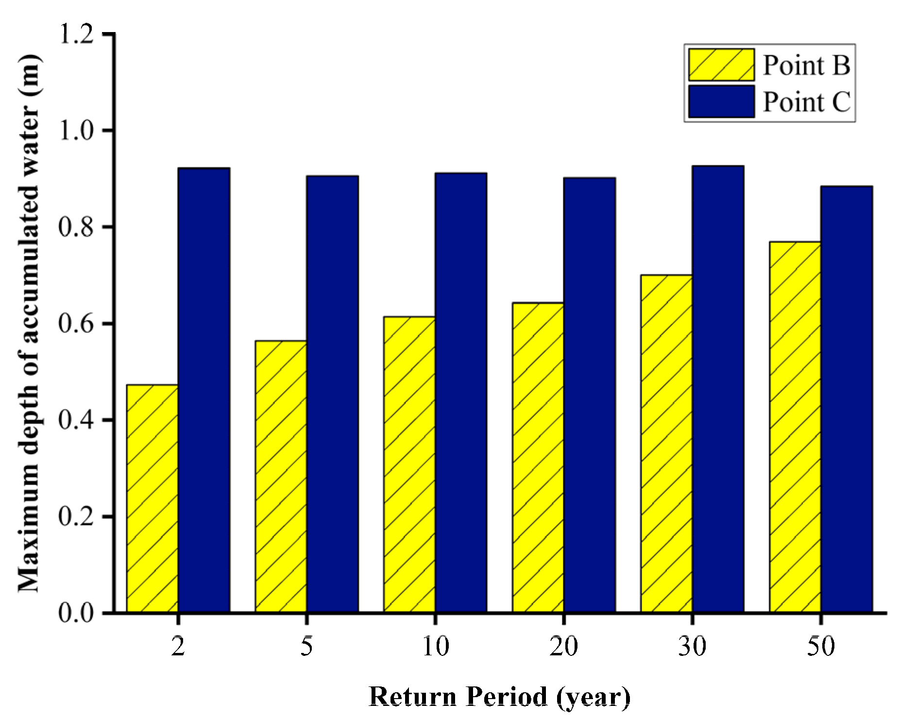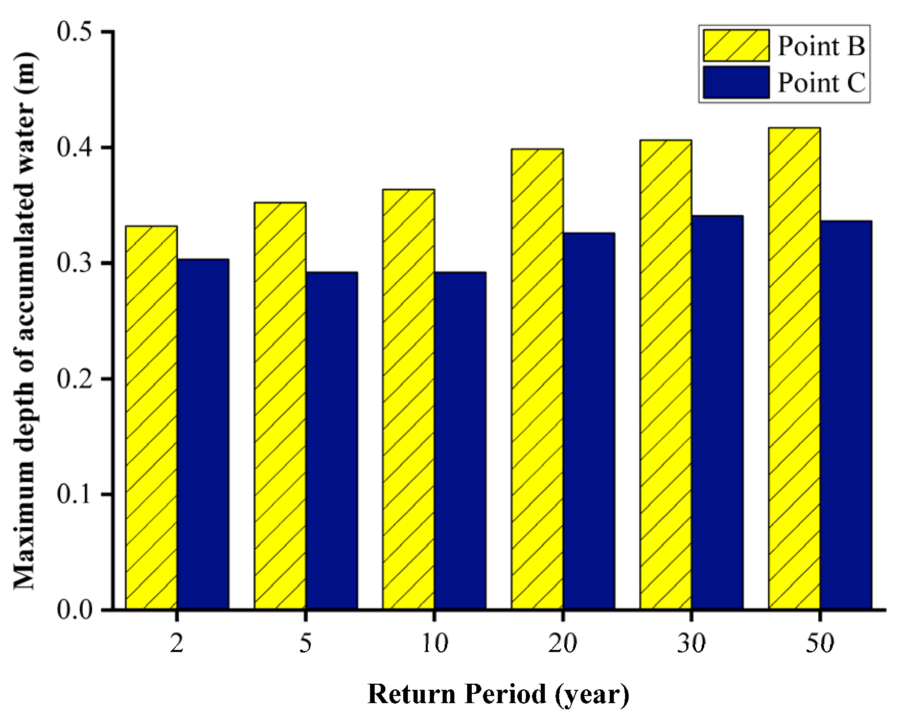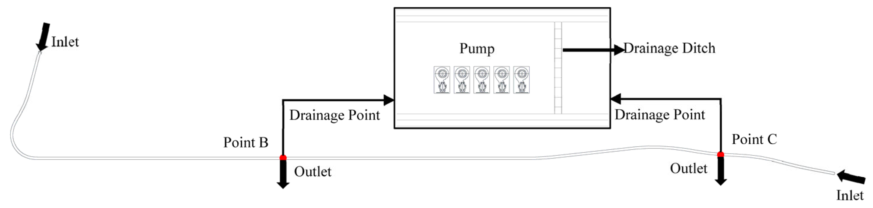 | Return-Period (Years) | Theoretical Inflow (m3) | Designed Drainage Capacity at Point B (m3) | Designed Drainage Capacity at Point C (m3) |