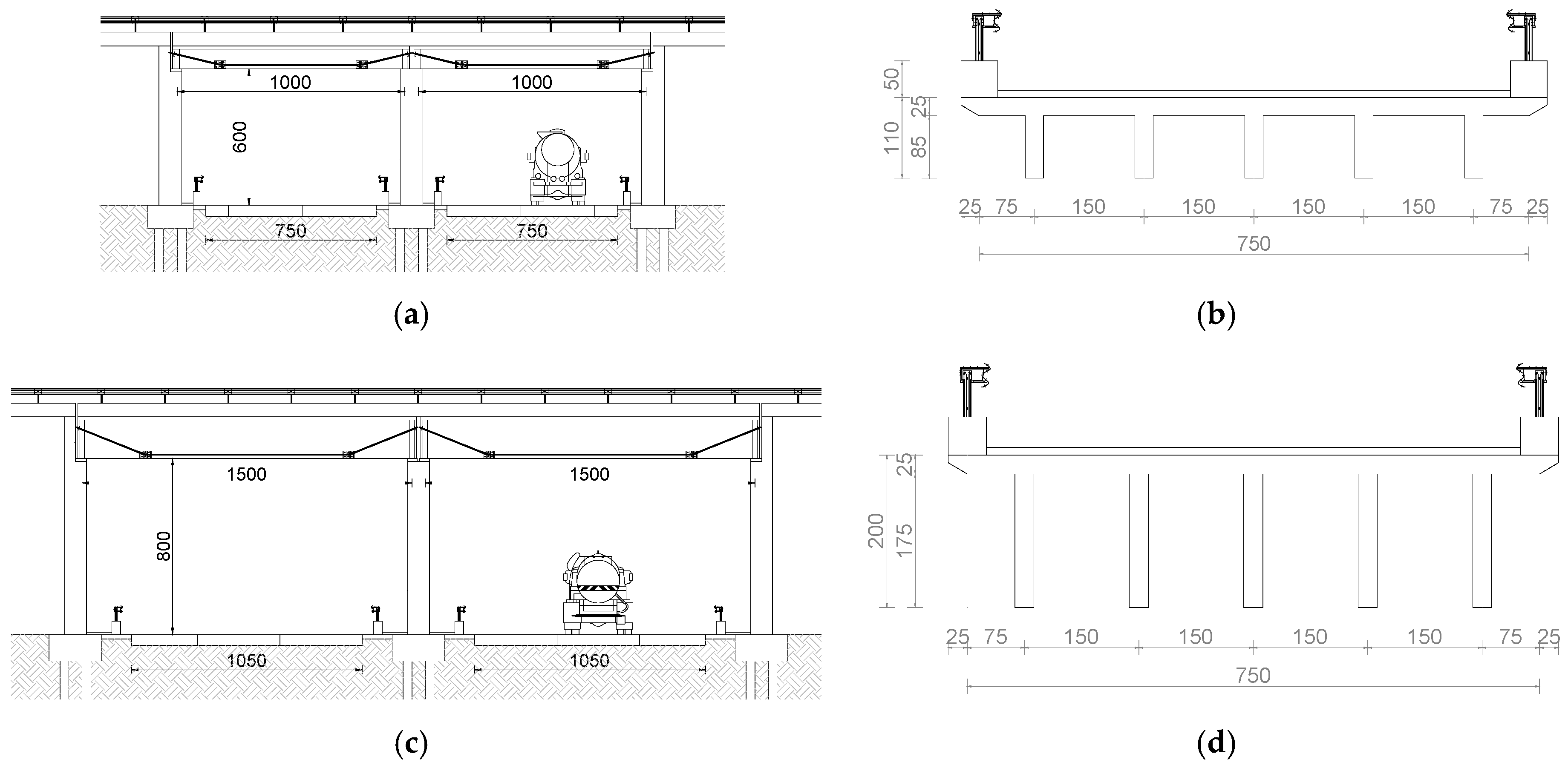 Figure 1c,d). As in the previous cases, four external prestressing tendons with a nominal diameter of 15 mm were adopted, each tensioned to an initial stress level of 1100 MPa. The parametric study again considered variations in both the applied fire exposure curve and the thickness of the protective sheath surrounding the tendons. Overpass clearance height was fixed to 8 m.