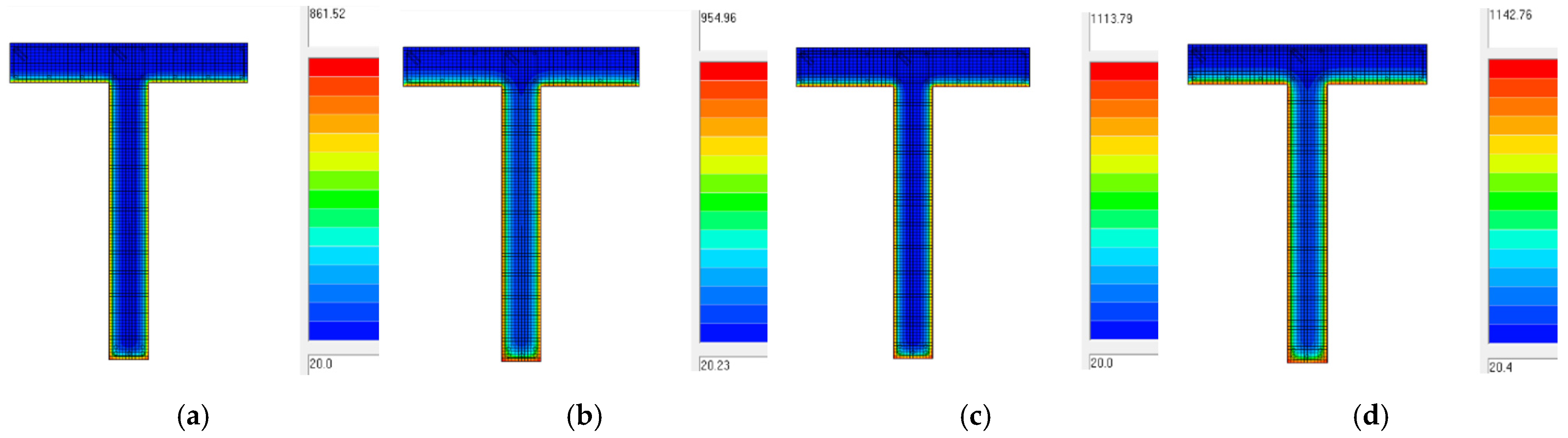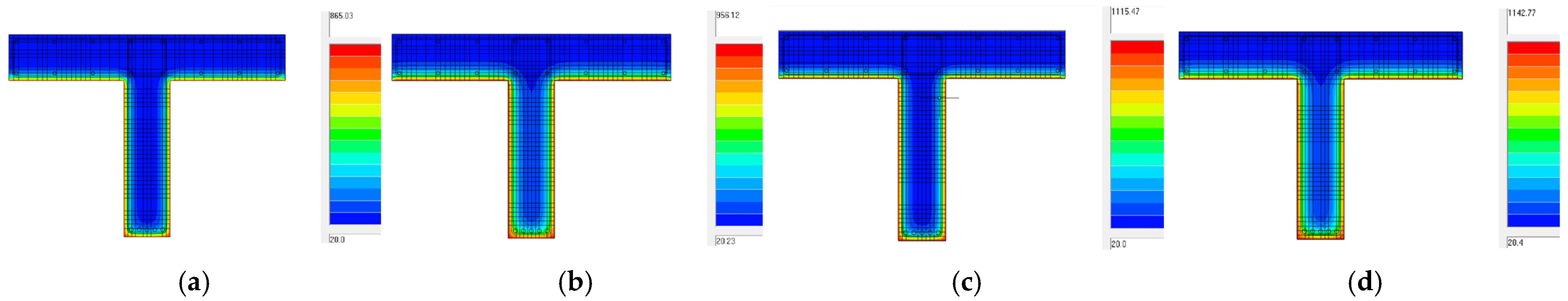 Figure 11 presents the temperature analysis performed on the T-shaped cross-section of the main beam. The load application followed the same procedure as in the previous case, with actions applied to the outermost beam of the deck, identified as the most critical in terms of loading. The ultimate bending moment was assessed throughout the progressive degradation of external prestressing induced by fire exposure. Once the prestressing system became ineffective, the structural response of the RC beam without external prestressing was subsequently evaluated.