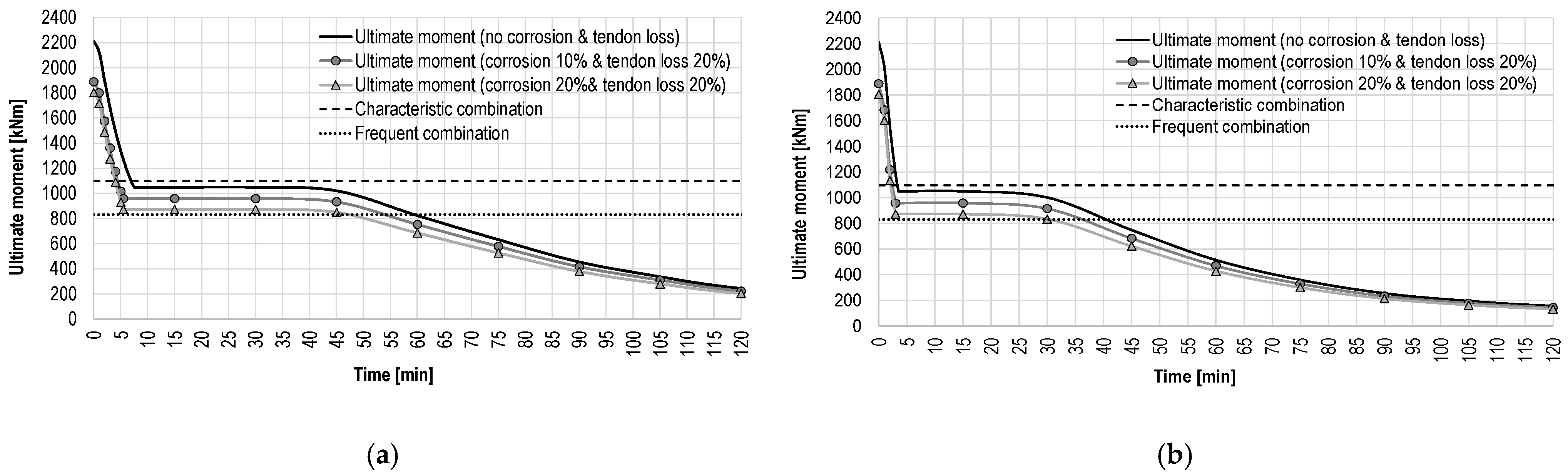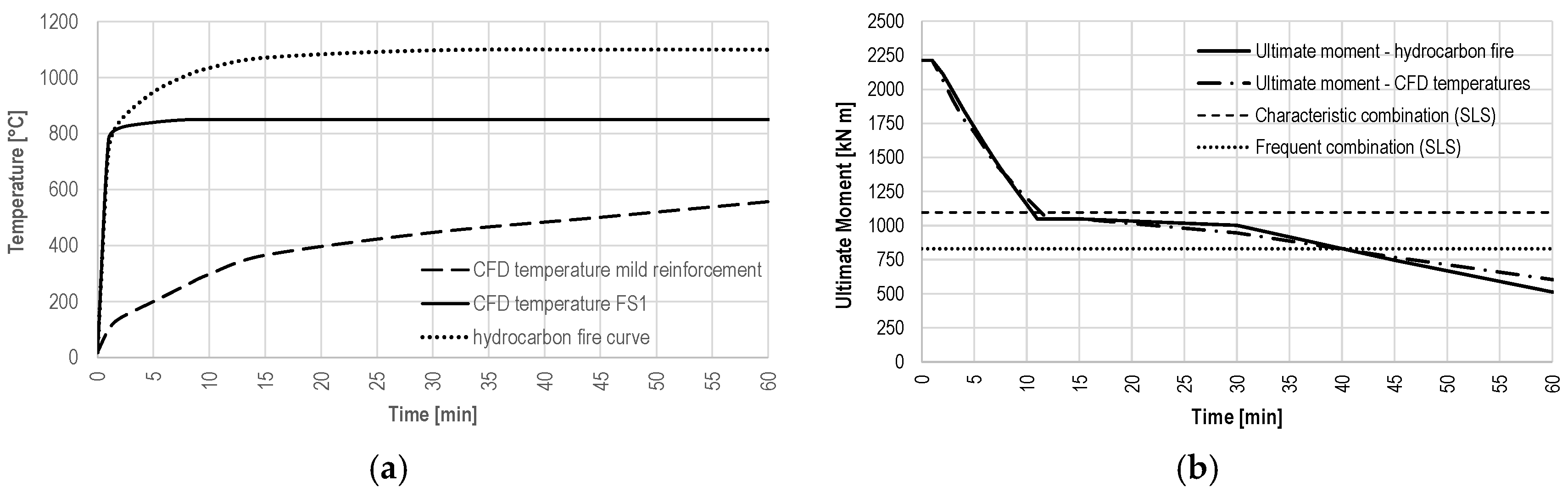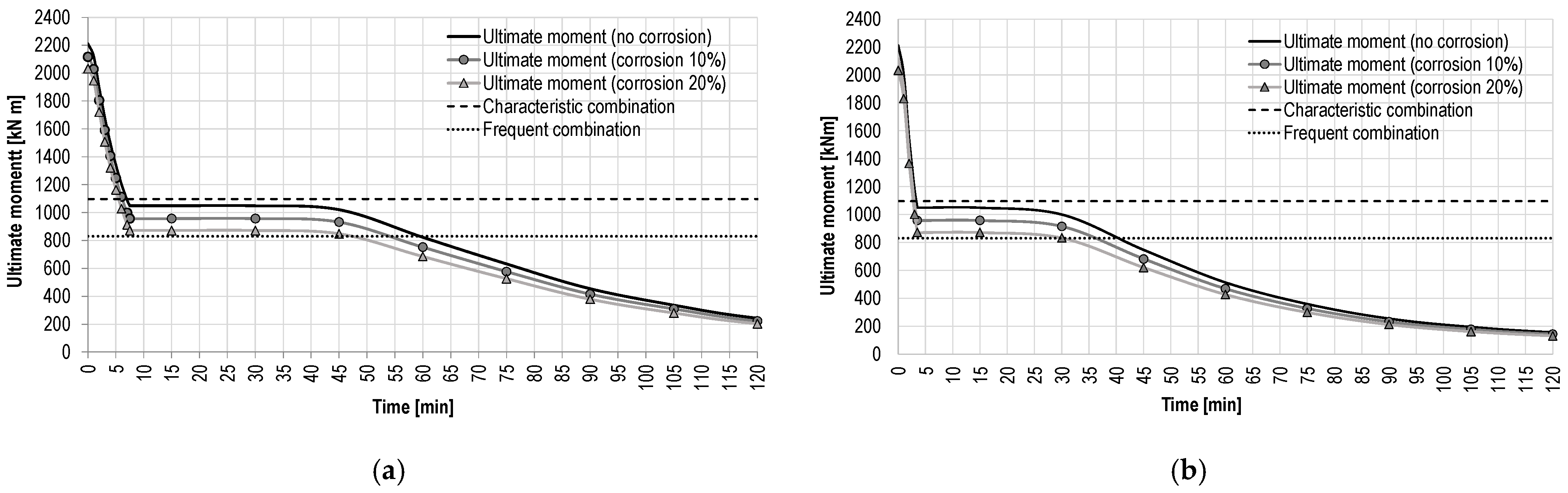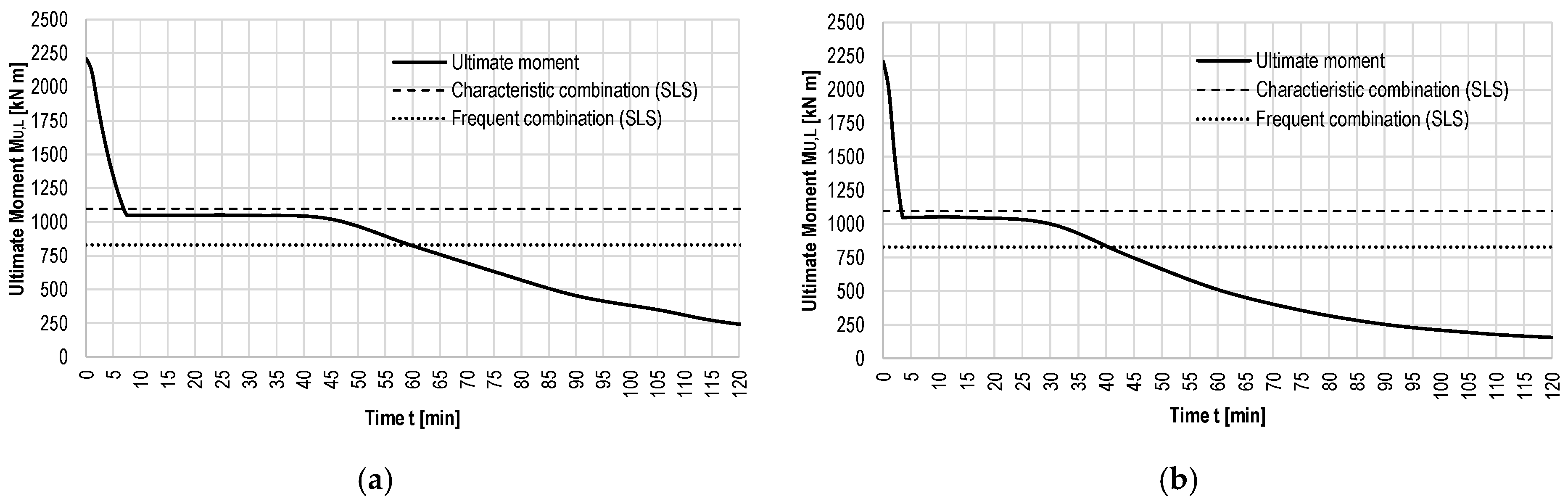 Figure 7 are measured, for the RC section, at the bottom web reinforcement, as these are the most exposed and most relevant with respect to the ultimate bending moment of the simply supported beam. The plateau of the ultimate moment below the characteristic load combination represents the original RC ultimate moment prior to degradation of the mild reinforcement due to fire (1040 kNm). Consequently, under the standard fire scenario, failure corresponding to the value of ultimate moment equal to that of the frequent load combination occurs after approximately 60 min. Under hydrocarbon fire exposure, the corresponding failure time is reduced to around 40 min. This indicates that, for the frequent combination of moving loads, the bridge retains sufficient load-bearing capacity for a duration adequate to ensure safety following the accident and fire ignition. In contrast, the characteristic load combination is not maintained for a time interval compatible with the arrival of rescue teams and the implementation of traffic interruption measures. All evaluations assume unitary strength safety factors.