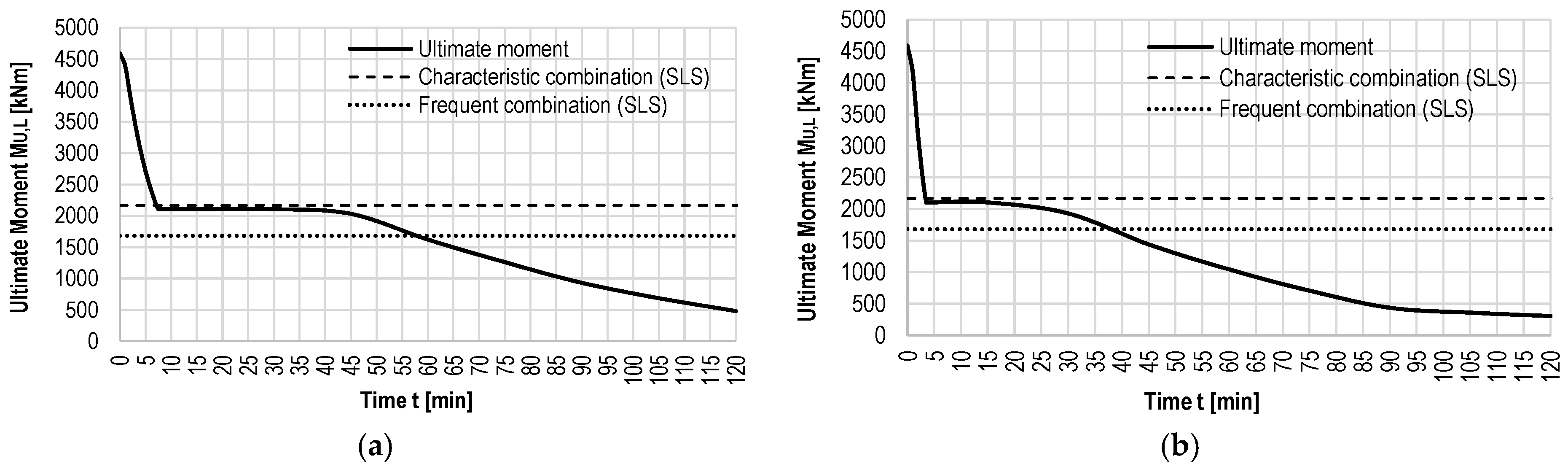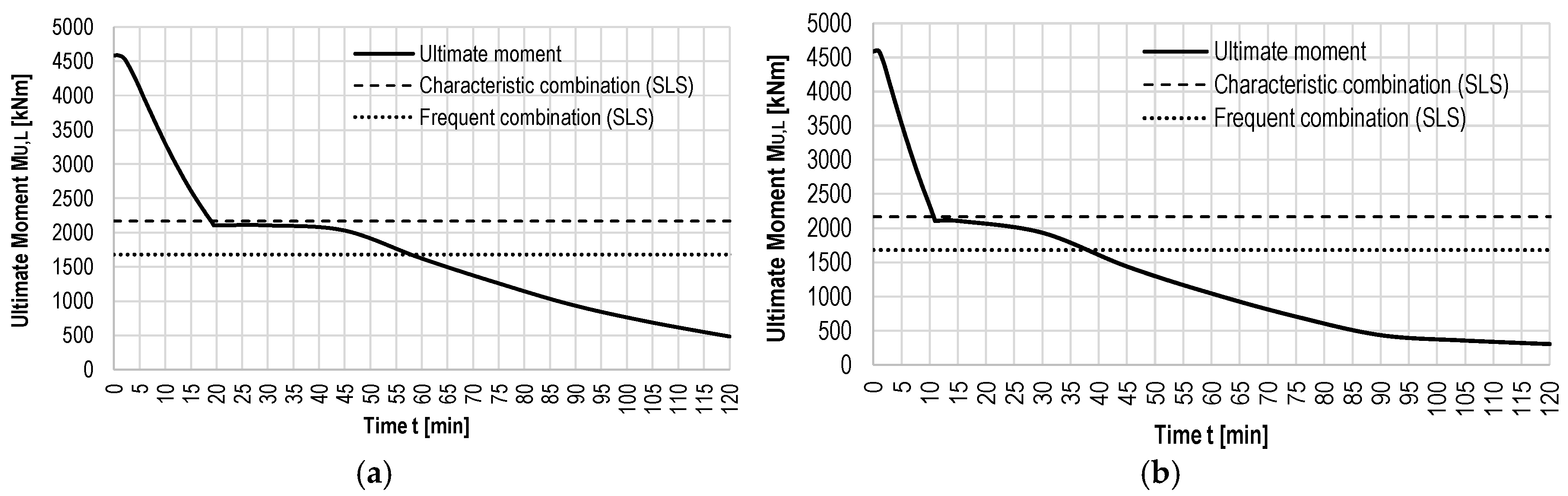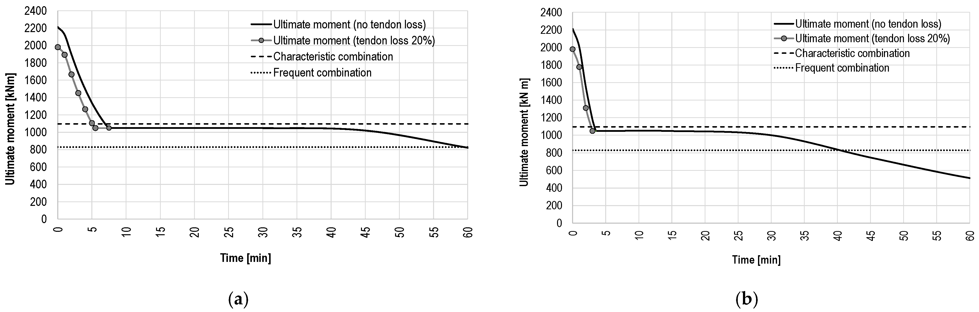 Due to prestressing degradation during fire, the ultimate bending moment decreases from the initial value of 2200 kNm (with prestressing) to the value that corresponds to the characteristic load combination (1100 kNm) approximately 7 min after fire ignition when the standard fire curve is applied. In contrast, the hydrocarbon fire reaches the same moment in less than 5 min.