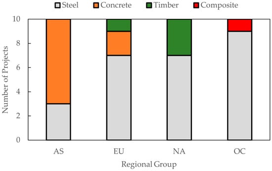 Figure 1 presents the distribution of modular building projects across various continental regions, with a breakdown by material type [15]. Concrete is the most commonly used material in Asian modular construction, while steel is more widely used in Europe, North America, and Oceania. The use of composite materials remains limited globally, with only a small number of projects in Oceania. Although the dataset is not an exhaustive global inventory of modular building projects, it provides a representative indication of current material usage trends across the regions included.