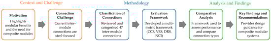 Inter-module connections are crucial to the structural integrity of modular buildings, as they facilitate effective load distribution between units. Researchers consider the lack of suitable inter-module connections to be a significant limitation in the modular construction sector [2,8]. Several review papers have examined these connections, primarily focusing on steel modules, leaving a notable gap in the literature regarding connections for steel–concrete composite modules. The paper addresses a key gap in the literature by presenting a review of current inter-module connection technologies, coupled with a multi-dimensional evaluation framework to assess their performance against four criteria, which include the applicability in steel–concrete composite modular construction. This paper seeks to provide insights into the types of connections designers can use to develop more effective, well-suited designs for steel–concrete composite modular structures. Figure 2 presents a conceptual roadmap of the study, illustrating the progression from context and challenges, through the methodology, to the analysis and key findings.
