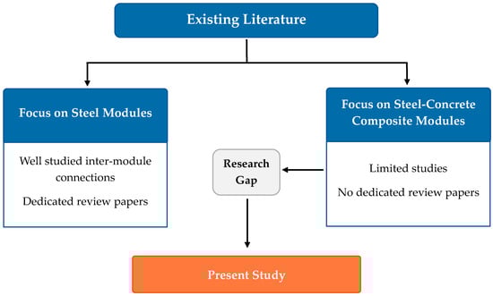 Figure 3 provides a visual summary of the gap highlighted in this section, contrasting the focus on steel modules in existing reviews with the limited attention to steel–concrete composite modules.