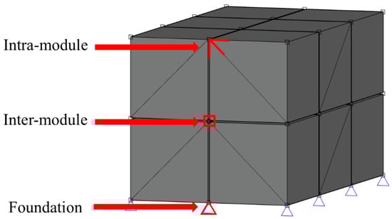 The structural behaviour of modular buildings, especially in high-rise applications, is complex and not yet fully understood, in part due to the critical role of inter-module connections. A critical aspect of ensuring stability in modular structures is the design of inter-module connections, which are responsible for transferring loads between prefabricated units. These connections play a key role in determining the overall stiffness of the structure and its ability to withstand both vertical and lateral forces [16,17]. In high-rise modular buildings, inter-module connections must accommodate various load paths and transfer loads between modules without compromising the structural stiffness or flexibility. Typically, connections in modular structures are designed to bear axial loads, bending moments, and shear forces, each of which affects the building’s global stability under different loading conditions, including gravity, wind, and seismic forces. For example, axial load transfer through column-to-column connections is crucial for maintaining vertical stability, while connections at the horizontal plane, such as beam-to-beam joints, ensure lateral load resistance.