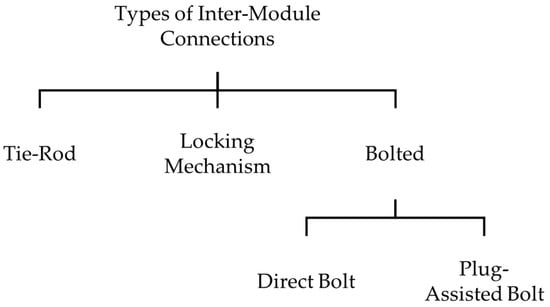 Corfar et al. [18] proposed a classification of inter-module connections similar to that of Thai et al. [8], grouping them into three main types. The first category is post-tension connections, equivalent to the tie-rod connections described by Thai et al. The second category includes locking device connections, aligning with Thai et al.’s plug-in connectors classification. The third category consists of bolted connections, which are also emphasised in Thai et al.’s classification. This study adopts a similar high-level classification approach.