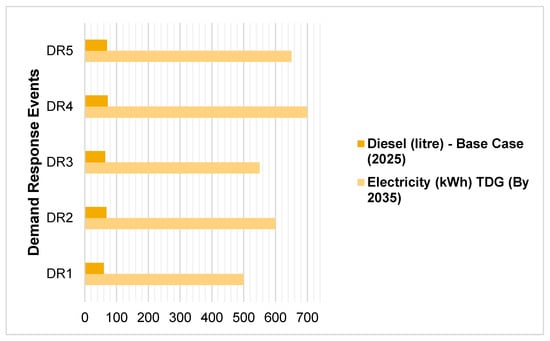 Figure 5 shows the comparison of reductions in grid electricity purchases and diesel generator consumption across five demand response events per year, assuming a critical load of 10% of the peak load and that each demand response event lasts about 2 h. Demand flexibility in commercial buildings is an emerging technological and policy focus [49], mainly because it improves buildings’ energy resilience and the greater utility of on-site renewable energy systems, which replace diesel generators as backup power during power outages. Power backup systems in many commercial buildings rely on diesel generators, which must be phased out to achieve the ‘Transitional Decarbonisation Goal (By 2035)’. The demand response simulation shows that the operational emissions can be reduced by up to 2800 kgCO2e per year and by around 0.24 kgCO2e/m2 in terms of emissions intensity in 2035 compared to 2025. In the Base Case (2025), although the diesel generator can contribute to the demand response programme and ease pressure on the electricity grid, it will not avoid demand response event-related emissions. In comparison, the battery storage system of 600 kWh capacity (auto-sized in HOMER Grid) participates in demand response events under the ‘Transitional Decarbonisation Goal (2025)’ to achieve dual objectives: demand flexibility and operational emissions reduction. Figure 5 shows the quantity of diesel consumption in demand response events in the ‘Base Case (2025)’ and the battery throughput in ‘Transitional Decarbonisation Goal (2025)’.