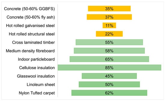 The achievable embodied emissions reduction depends on the material type and its mass (Figure 7). For example, concrete, with a much higher share of the total material mass, has a lower potential for embodied carbon emissions than internal finishes, insulation, and surface materials. A combination of concrete and metals contributes to almost 95% of the total material mass. However, the embodied carbon emissions reduction potential is less than 35% for each, meaning that almost 65% of upfront embodied carbon emissions are locked in throughout the lifecycle. By contrast, materials with relatively short service lives, such as insulation, internal finishes, and surface materials, can reduce embodied carbon emissions by more than 55% for each material type when considering the whole building lifecycle. Material substitution during fit-outs and refurbishment projects is an enabler of embodied carbon emission reductions (Figure 8), calculated as the difference between the embodied emissions of conventional materials and their low-carbon alternatives. Locally, the EPiC database [41] provides embodied emissions of some substitute materials. The lower embodied carbon emissions reduction potential of concrete and metals can be attributed to the substitute material’s embodied carbon emissions. For example, compared to ordinary concrete, the suitable alternative—concrete with ground-granulated blast furnace slag and fly ash—can reduce embodied carbon emissions by only around 35–37%. Market-ready alternatives to conventional insulation and surface materials also reduce embodied carbon emissions, with potential reductions of more than 50% for most materials.