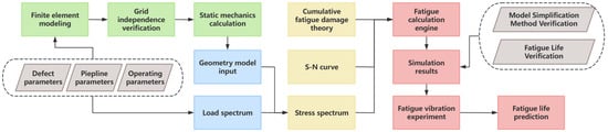 The methodology of this study includes material fatigue life calculation, construction of Pipeline Load Spectrum, finite element modeling of pipelines under pressure fluctuations, and predicting fatigue life under pressure using polynomial fitting [39,40]. The entire procedure is illustrated in Figure 1.