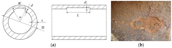 (a) Cross-section and longitudinal section of pipeline containing square corrosion defects. D denotes the pipeline diameter, d is the defect corrosion depth, L is the axial corrosion length, W is the circumferential corrosion width, and t is the wall thickness; (b) Actual image of sheet-like volumetric defect in pipeline.