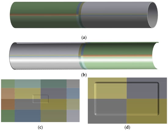 Static mechanical model of defective pipelines: (a) Overall external view of the pipeline on the defective side; (b) Overall internal view of the pipeline on the defective side; (c) Enlarged view of the defective area; (d) Local enlarged view of the defect.