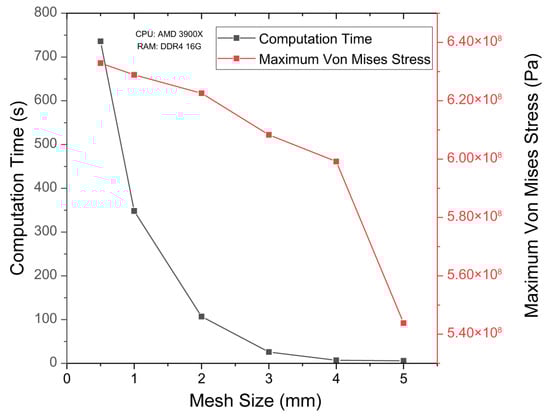 As the pipeline is an axisymmetric structure, hexahedral meshing with favorable numerical stability and convergence is adopted [47,48]. To ensure the simulation results are independent of mesh size, a mesh independence study was conducted with defect region mesh sizes ranging from 5 mm to 0.5 mm. The mesh independence test results are shown in Figure 4. The maximum von Mises stress under an internal pressure of 10 MPa and the computation time were used as evaluation criteria.
