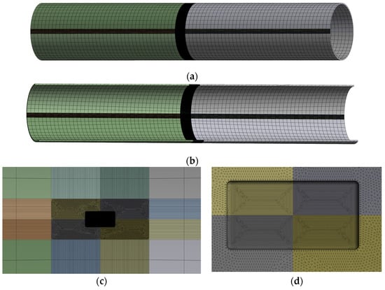 Mesh of defective pipes: (a) Overall external view of the pipeline on the defective side; (b) Overall internal view of the pipeline on the defective side; (c) Enlarged view of the defective area; (d) Local enlarged view of the defect.