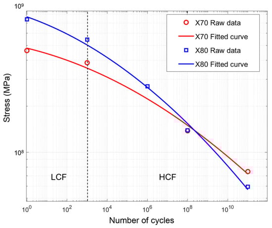 Literatures [51,52] indicates that in nCode, “BS4360 Grade 40B” can be used for simulation because when simulating the fatigue behavior of X70 steel, using this built-in material data of nCode yields results that reasonably align with practical engineering experience. Moreover, the data for yield strength and tensile strength are relatively close (Yield Strength is around 400 MPa, Tensile Strength ranges from 340 to 500 MPa), thus allowing for the derivation of an approximate S-N curve. The S-N curve of this material is shown in Figure 6, fitted using the software’s built-in fitting method. For the S-N curve of X80, this study adopts the fatigue characteristic calculation method provided by the Chinese standard [53,54]. For X80 steel with a tensile strength of 739 MPa, the reference data points for “unalloyed and low-alloy steels not exceeding 370 °C” were selected for interpolation calculations. After interpolation processing, standardized fatigue characteristic parameters were obtained. Using data fitting methods, the S-N curve for X80 was established, as shown in Figure 6 as well. The stress ratio corresponding to the S-N curves is R = −1. The software integrates a small-cycle correction function based on the BS7608 standard [55]: The dividing line in the S-N curve is used to distinguish between high-cycle and low-cycle fatigue. When the maximum stress cycle number is below the life corresponding to 103 in the S-N curve, it is defaulted as structural failure. Here, LCF denotes Low-cycle fatigue. During simulation, the software only calculates the HCF portion, and results falling within the LCF range will be displayed as “static failure”.