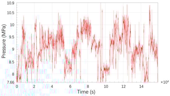 This study selects one year of pressure data from a section of the Sichuan-East Gas Pipeline, with a sampling frequency of 1 Hz. The data, recorded at 1 Hz over 365 days, were averaged per second, with two-day intervals used as time history units, as shown in Figure 7. This data represents the averaged results, which smooth out random noise, highlight the main fluctuation trends, and make subsequent fatigue calculations more efficient, although occasional rapid pressure transient peaks may have been smoothed out. This approach is mainly because this study focuses on establishing a methodological framework, for which the data provides an engineering-representative load spectrum input.