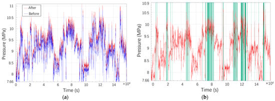 Data cleaning of pressure monitoring records: (a) Comparison before and after zero-drift correction, with the blue line representing raw data and the red line representing corrected data; (b) Comparison before and after spike removal, where the red line denotes the processed data and the green vertical bars indicate the locations of removed outliers.