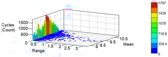 The fundamental assumption of Miner’s theory is that fatigue damage can be linearly accumulated across different stress cycles, independent of the sequence of load application. To apply this theory, the random load history must first be processed using the rainflow counting method [60,61,62]. This method decomposes the complex stress-time history into a series of stress cycles, thereby transforming continuous random vibrations into calculable cyclic data. Each identified stress cycle, with its amplitude, can be correlated with the constant stress amplitude in the S-N curve to calculate the resulting damage. Figure 9 presents the statistical results obtained by applying the rainflow counting method to pipeline pressure fluctuation data in this study, visually illustrating the distribution of stress amplitude cycles. During simulation, the software utilizes these results, combined with Miner’s theory, to calculate the fatigue damage and fatigue life at various locations of the pipeline.