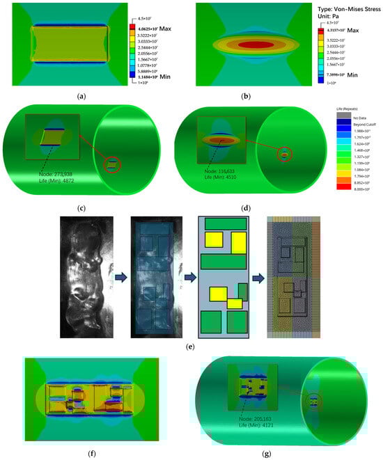 Stress and fatigue life for different idealized defect models: (a) Stress distribution in the rectangular idealized defect region; (b) Stress distribution in the semi-ellipsoidal idealized defect region; (c) Calculated fatigue life for the rectangular idealized model; (d) Calculated fatigue life for the semi-ellipsoidal idealized model; (e) Process of establishing the Complex-shape Pit model based on data from the literature; the blue part has a depth of 2.2 mm, the green part has a depth of 3.3 mm, and the yellow part has a depth of 4.4 mm; (f) Stress distribution in the Complex-shape Pit defect region; (g) Calculated fatigue life for the Complex-shape Pit model.