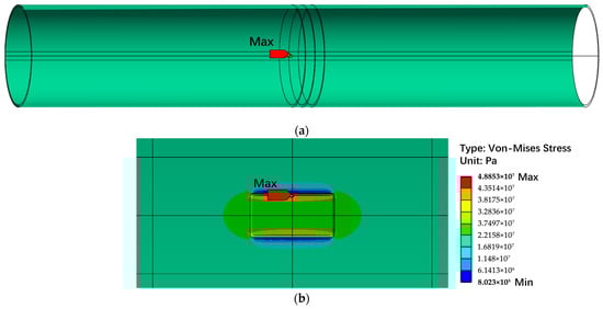 After setting various module parameters, the equivalent stress distribution of the pipeline was obtained. Under the condition of corrosion depth coefficient k1 = 0.1, corrosion length coefficient k2 = 0.5, and corrosion width coefficient k3 = 0.02, the results are shown in Figure 11. The maximum equivalent stress value is concentrated in the stress concentration area at the inner corner of the axial edge of the defect groove, with a maximum stress of 48.85 MPa, which is significantly lower than the material’s yield strength of 492 MPa.