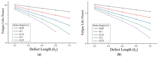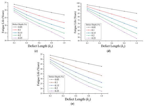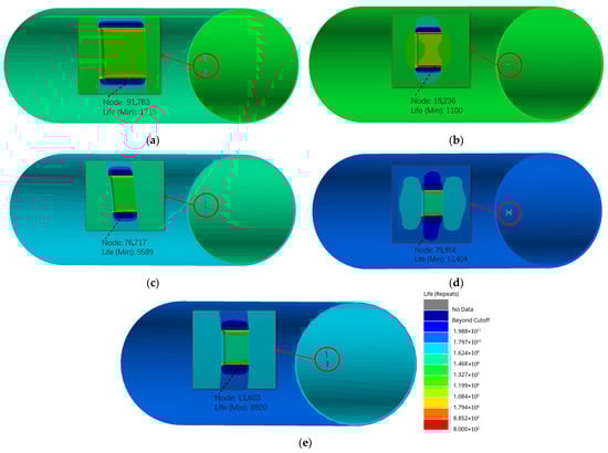 After importing the static equivalent stress simulation results into nCode, the fatigue analysis method was set to Miner’s rule, and the Stress Gradients function was enabled to account for notch effects (based on the FKM method). By inputting parameters such as material properties and loading conditions, the fatigue life of the pipeline was obtained for corrosion defect depth coefficients k1 ranging from 0.05 to 0.25, length coefficients k2 from 0.2 to 1.0, and width coefficients k3 from 0.02 to 0.10. The fatigue life value directly output by the software represents the number of cycles the structure can withstand under the applied loading. For ease of discussion, this cycle count was converted into an equivalent service life in years. The fatigue load of the pipeline was obtained from high-precision sensors, collecting pressure values at a frequency of once per second (fs = 1 Hz). After cleaning the original data, the formed effective load sequence contained n = 1.58 × 105 discrete points, each point corresponding to a time interval of Δt = 1 s. In the fatigue life analysis, a single complete cycle is defined as the process starting from the load initial point, traversing all data points, and returning to the initial state, with a time span of: tcycle = n·Δt = 1.58 × 105 s. The fatigue life result obtained through simulation is expressed by the number of cycles N. For a convenient engineering assessment, it needs to be converted into actual service life in years. The relationship between the total time Ttotal and the number of cycles is: Ttotal = N·tcycle = N·1.58 × 105 s. Further, through unit conversion, the total time is converted to years. Thus, the linear relationship between life in years and the number of cycles can be expressed as Tyear = 0.00504 N. A subset of the simulation results is presented below. For the case with a corrosion depth coefficient k1 = 0.1, length coefficient k2 = 0.5, and width coefficient k3 = 0.02, the corresponding data are summarized in Table 5. In the table, the characteristic dimensions of the defects have been converted into actual sizes according to each pipeline specification.