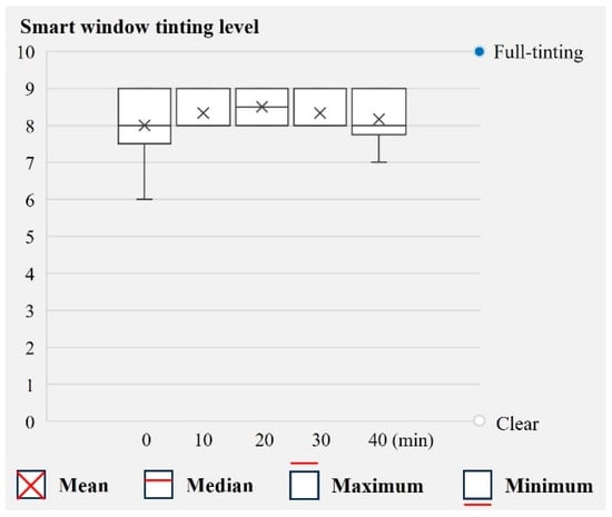 The thermal sensation indices during the 40 min survey period are shown in Figure 10. The PMV values (Figure 10c) in both rooms were controlled to remain within ±0.5 throughout the survey, in accordance with the predefined environmental conditions, and the mean PMV values in the RoomSW and RoomCW were 0.0 and +0.1, respectively. With respect to the TSV responses of the occupants (Figure 10d), the TSV values in both RoomSW and RoomCW were within the comfort range except at the time of entry, and the occupants generally perceived the rooms to be cooler than those indicated by the PMV index. The mean TSV values were −0.5 and −0.4 in the RoomSW and RoomCW, respectively, indicating no substantial difference between the two spaces. In the case of thermal environment satisfaction (Figure 10e), large variations were observed depending on individual tendencies, and the mean satisfaction scores were 0.0 and −0.1 in the RoomSW and RoomCW, respectively, indicating no substantial difference between the two rooms, similar to the TSV responses. Statistical analysis revealed that the differences in PMV, TSV, and thermal environment satisfaction between the two rooms were not statistically significant, and considering the effect sizes, these differences could be interpreted as practically negligible (Table 11). Although the glare prevention tint control algorithm was in operation, the subjective thermal sensation and satisfaction of the occupants did not differ from those in the room with a conventional window. The results suggested that in the absence of a meaningful difference in the physical thermal environment, smart window tinting would not induce changes in the thermal sensation or satisfaction of the occupants, and its influence would likely be further reduced by the fact that the smart window was not in a fully tinted state.