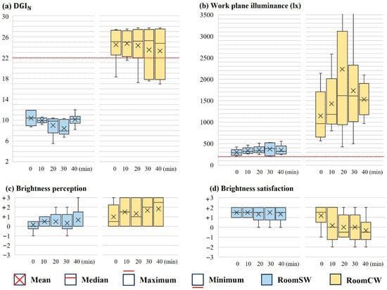 The glare index data during the 40 min survey period are shown in Figure 11. In the RoomSW, the DGIN (Figure 11a) remained below 22, the threshold for judging the occurrence of glare, throughout the survey, indicating that glare did not occur. In contrast, in the RoomCW, the mean DGIN exceeded 22 at all times, and when interpreted with reference to the median, the DGIN was above 22 in more than half of the cases, indicating that glare occurred. The mean DGIN values in the RoomSW and RoomCW were 9.6 and 24.1, respectively. Statistical analysis revealed that the difference in the DGIN between the two rooms was statistically significant (p < 0.001), and considering the effect size (Cohen’s d ≥ 0.8), this difference could be interpreted as very large in practical terms (Table 11).