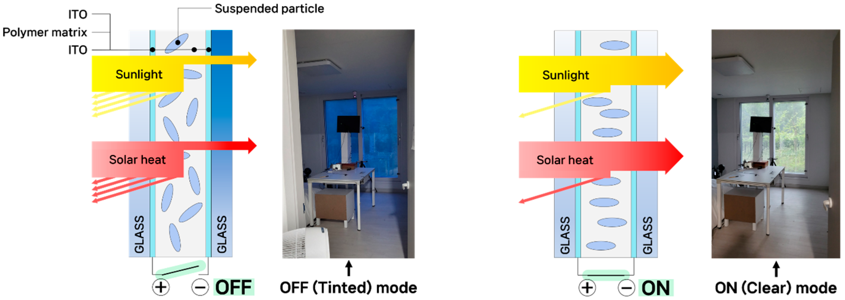 Smart windows represent functional glazing systems that can be used to control solar radiation entering a building by adjusting the solar heat gain coefficient (SHGC) and visible transmittance (VT). These systems are classified into passive and active types depending on whether electrical power is required for their operation. The smart window applied in this study is an active suspended particle device (SPD) window, which operates on the principle that particles randomly dispersed in the off (tinted) state become aligned in the on (clear) state, allowing light to pass through. SPD smart windows are characterized by a very short switching (tinting) time and by the ability to finely adjust the transmittance at multiple levels according to the magnitude of the applied alternating current (AC) power. The operating principle of the smart window is illustrated in Figure 1, which shows its appearance in the tinted and clear states. By appropriately controlling the smart window in response to indoor and outdoor environmental conditions and occupant preferences, it is possible to achieve both energy savings and increased occupant comfort (e.g., preventing glare while maintaining adequate illuminance). With growing interest in green buildings and sustainable architecture and advances in related technologies, the smart window market is expected to expand in the future. According to a market research report by the International Market Analysis Research and Consulting (IMARC) group [5], the smart window market size is projected to increase from USD 1.2773 billion in 2023 to USD 3.88 billion in 2032, corresponding to a compound annual growth rate (CAGR) of approximately 12.7%.
