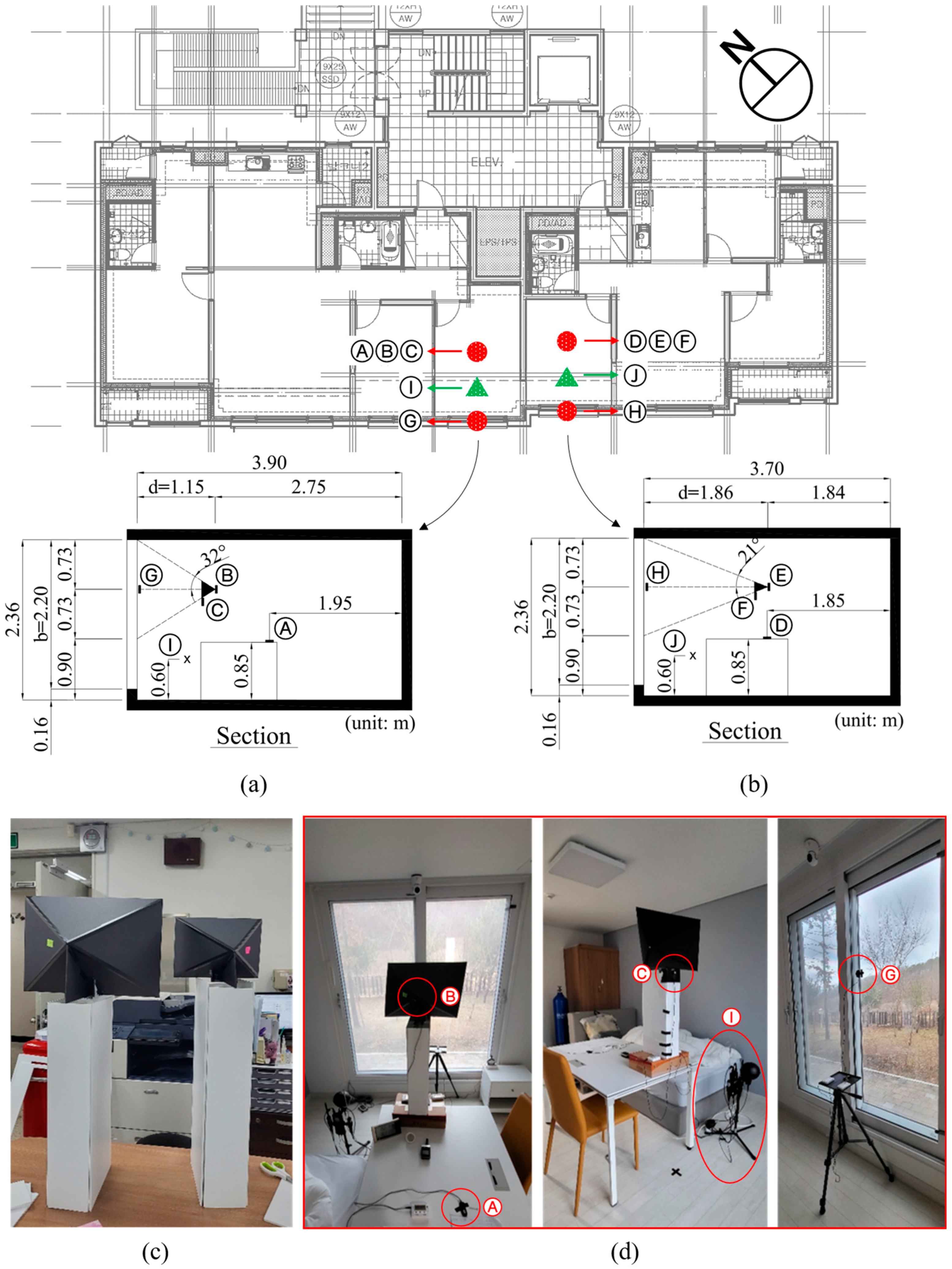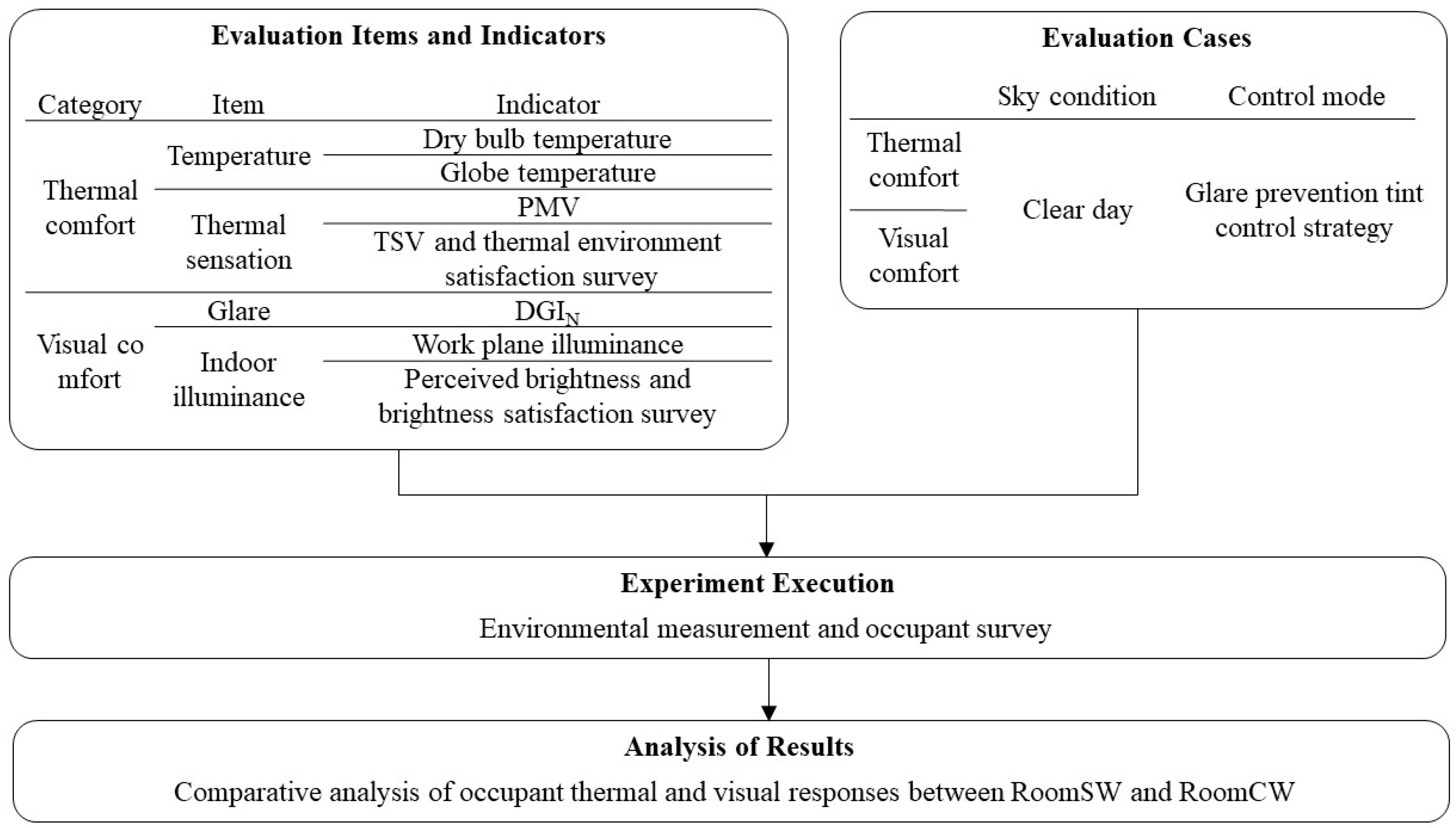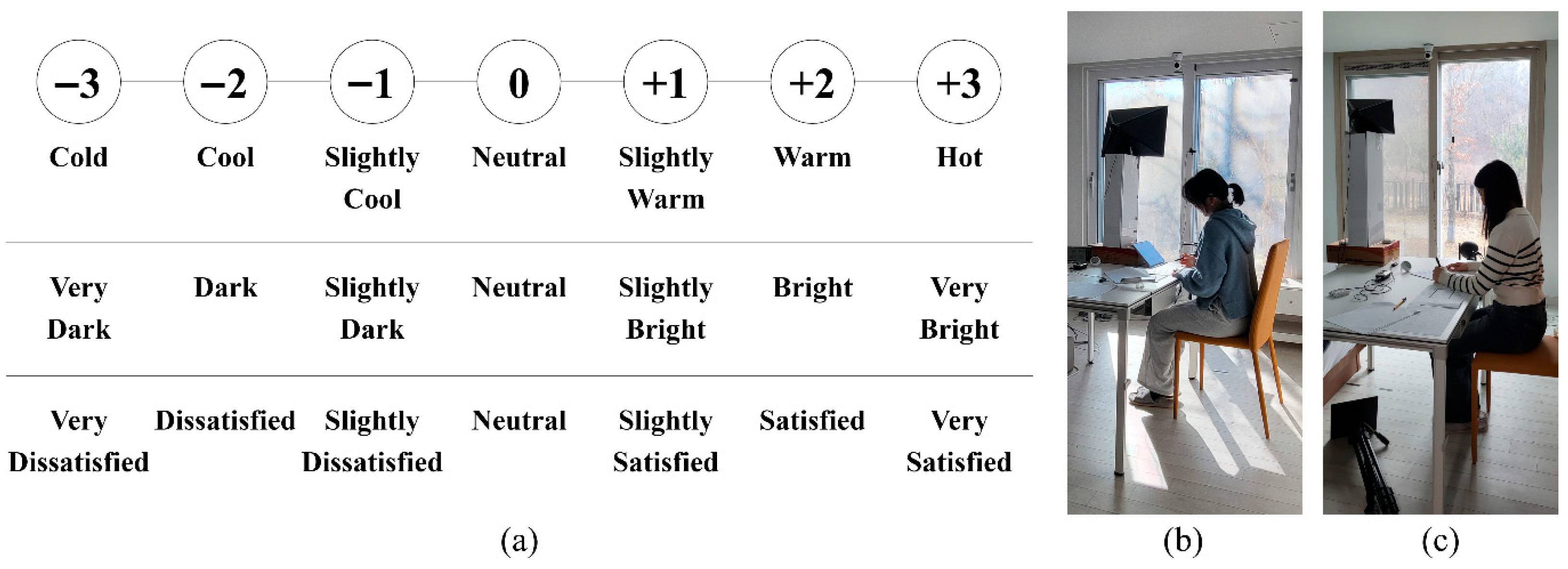 Figure 3 illustrates the overall research flowchart, while Table 3 details the evaluation items and indices defined for thermal and visual comfort. Temperature and thermal sensation were selected as evaluation items for thermal comfort, whereas glare and indoor illuminance were selected as evaluation items for visual comfort. For temperature, dry bulb and globe temperatures were adopted as objective evaluation indices. For thermal sensation, the PMV was used as an objective index, and the thermal sensation vote (TSV) and a questionnaire on satisfaction with the thermal environment were employed as subjective indices. For glare, the DGIN was adopted as an objective evaluation index, whereas for indoor illuminance, work plane illuminance was used as an objective index, and survey responses on perceived indoor brightness and brightness satisfaction were used as subjective indices. For thermal comfort, objective assessments based on dry bulb temperature, globe temperature, and PMV were compared with the subjective questionnaire responses of the subjects. For visual comfort, objective analyses of glare occurrence and illuminance adequacy were conducted using the DGIN and work plane illuminance, and these results were compared with the subjective questionnaire responses of the subjects.
