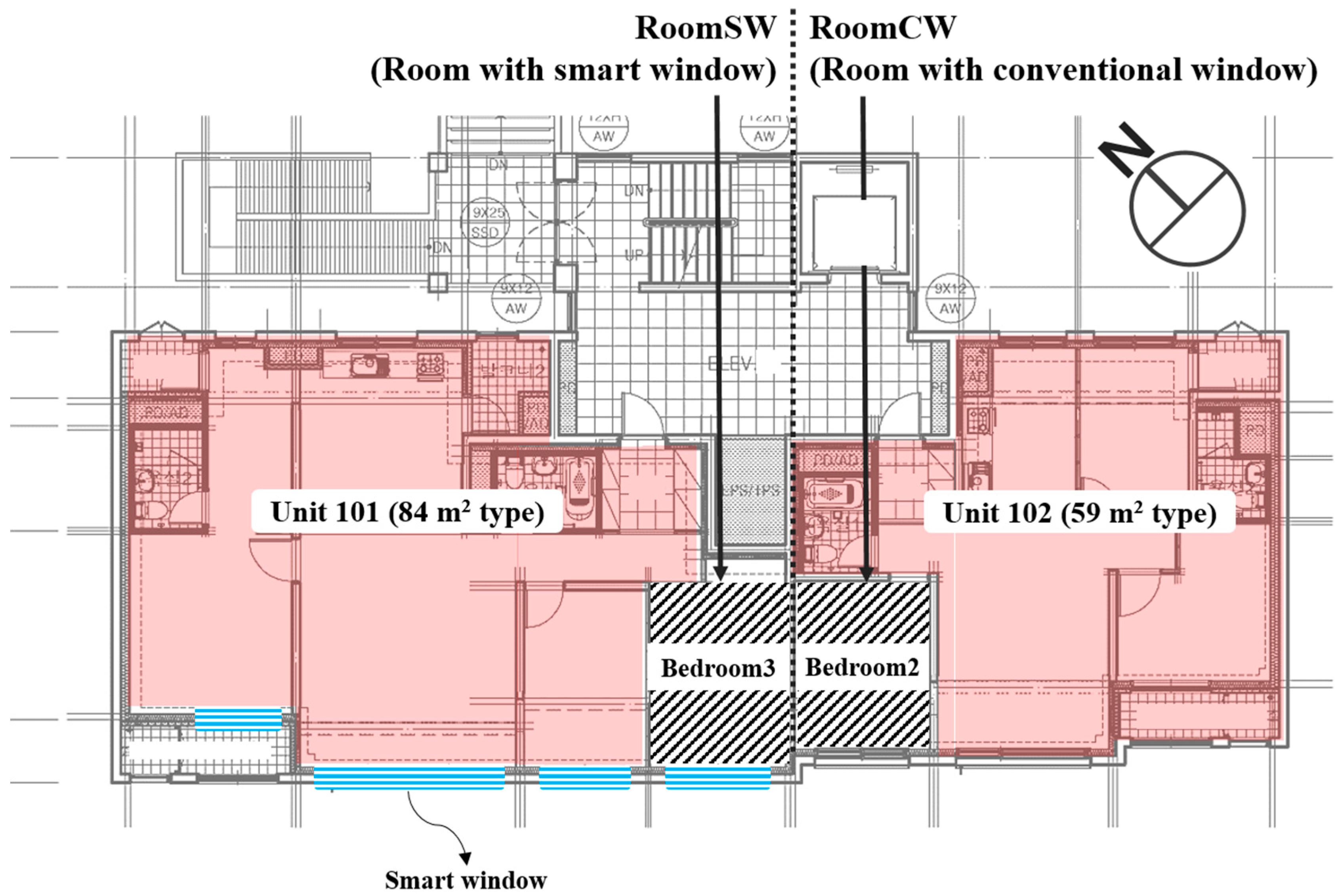 The case study building is a multifamily residential-type experimental building located in Sejong, Republic of Korea, and it is oriented to the southwest. Each floor consists of one 84 m2 unit (Unit 101) and one 59 m2 unit (Unit 102) (Figure 5). An SPD smart window was installed on the main façade of Unit 101, whereas a conventional double-glazed window was installed on the main façade of Unit 102. Bedroom 3 in Unit 101 (RoomSW, room with a smart window) and Bedroom 2 in Unit 102 (RoomCW, room with a conventional window) were selected as the experimental spaces because their floor areas were similar and their window sizes were identical, making them suitable for comparative analysis. No additional solar control devices were installed in the RoomSW or RoomCW, and the internal heat gains due to occupants, lighting, and equipment were kept the same in both rooms. The window performance characteristics for each room are summarized in Table 6.