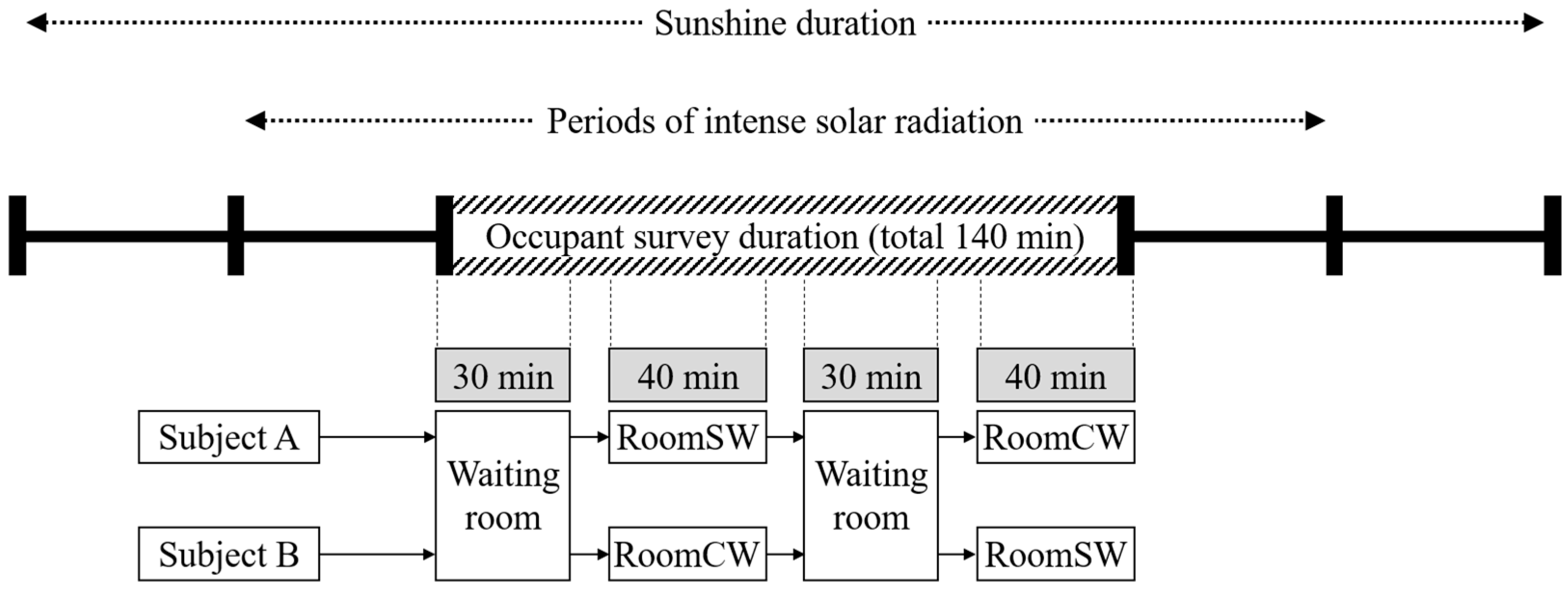 Before entering the RoomSW and RoomCW, all participants spent a certain period in a waiting area for stabilization. The waiting area was controlled such that the PMV was within ±0.5 and the air velocity was below 0.2 m/s [15], and the horizontal illuminance was set to 400–500 lx using electric lighting. All participants wore clothing corresponding to an insulation level of 1.0 clo, and the metabolic rate was set to 1.0 met (seated, relaxed) [14]. As shown in Figure 7, the experiment was conducted such that two participants first spent 30 min stabilizing in the waiting area and then moved to the RoomSW and RoomCW, where they remained for 40 min. This process was repeated twice in a crossover manner (total duration of 140 min). Each participant experienced both the RoomSW and RoomCW once, resulting in two data sets per room being obtained for each experimental day.