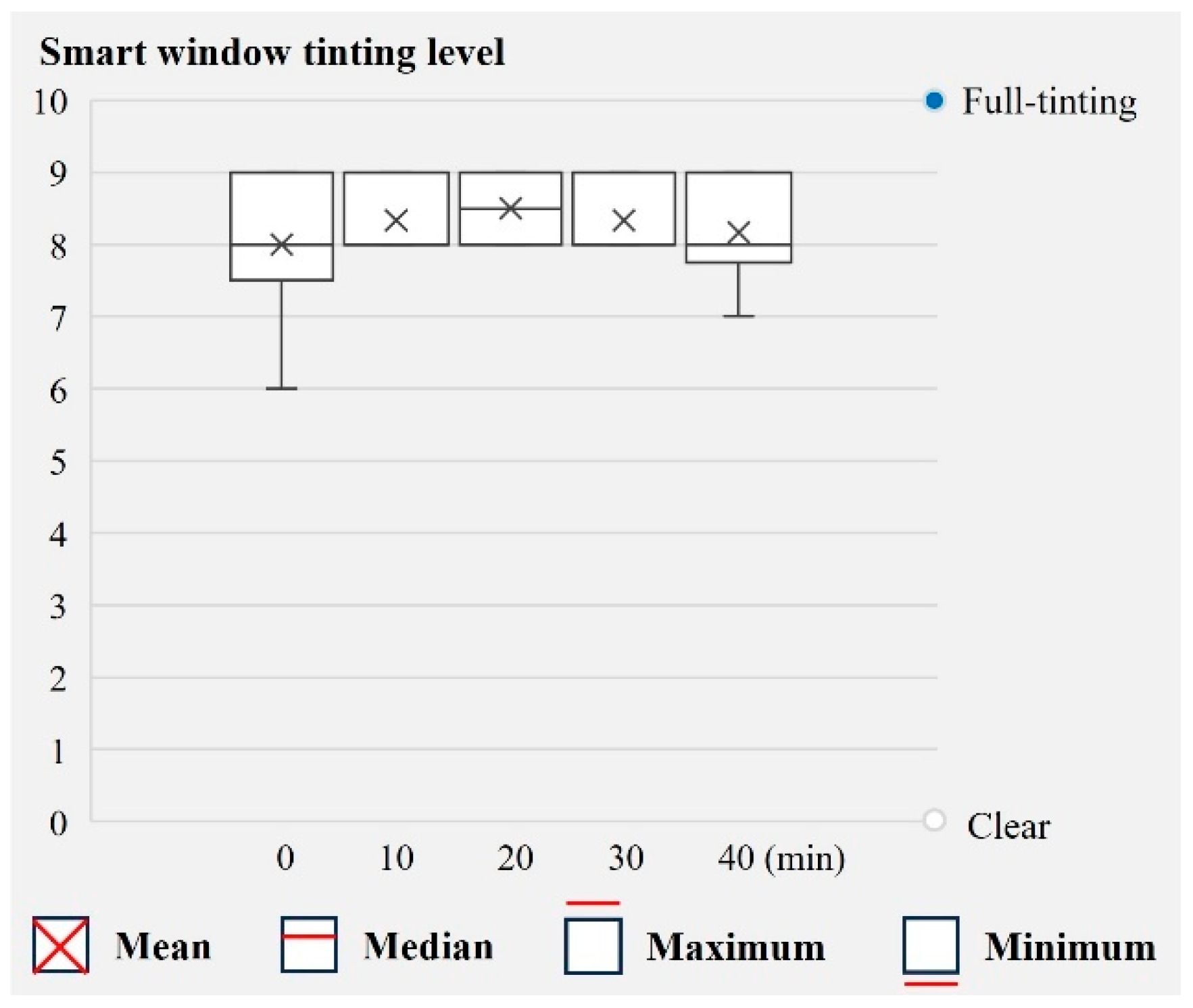From an energy performance perspective, in winter, it is advantageous not to tint smart windows because tinting can reduce solar heat gains and thereby increase heating energy consumption. However, even in winter, it is necessary to prevent glare by tinting the smart window. Previous research [12] has shown that in winter, a glare prevention tint control strategy that keeps the smart window clear under normal conditions and tints it in a stepwise manner when glare is likely to occur is the most effective strategy when both energy and comfort are considered. Accordingly, in this study, occupant thermal and visual comfort levels were evaluated with a glare prevention tint control strategy, which is expected to be widely applied as a smart window tint control approach for winter because it can maximize the benefits of smart windows.