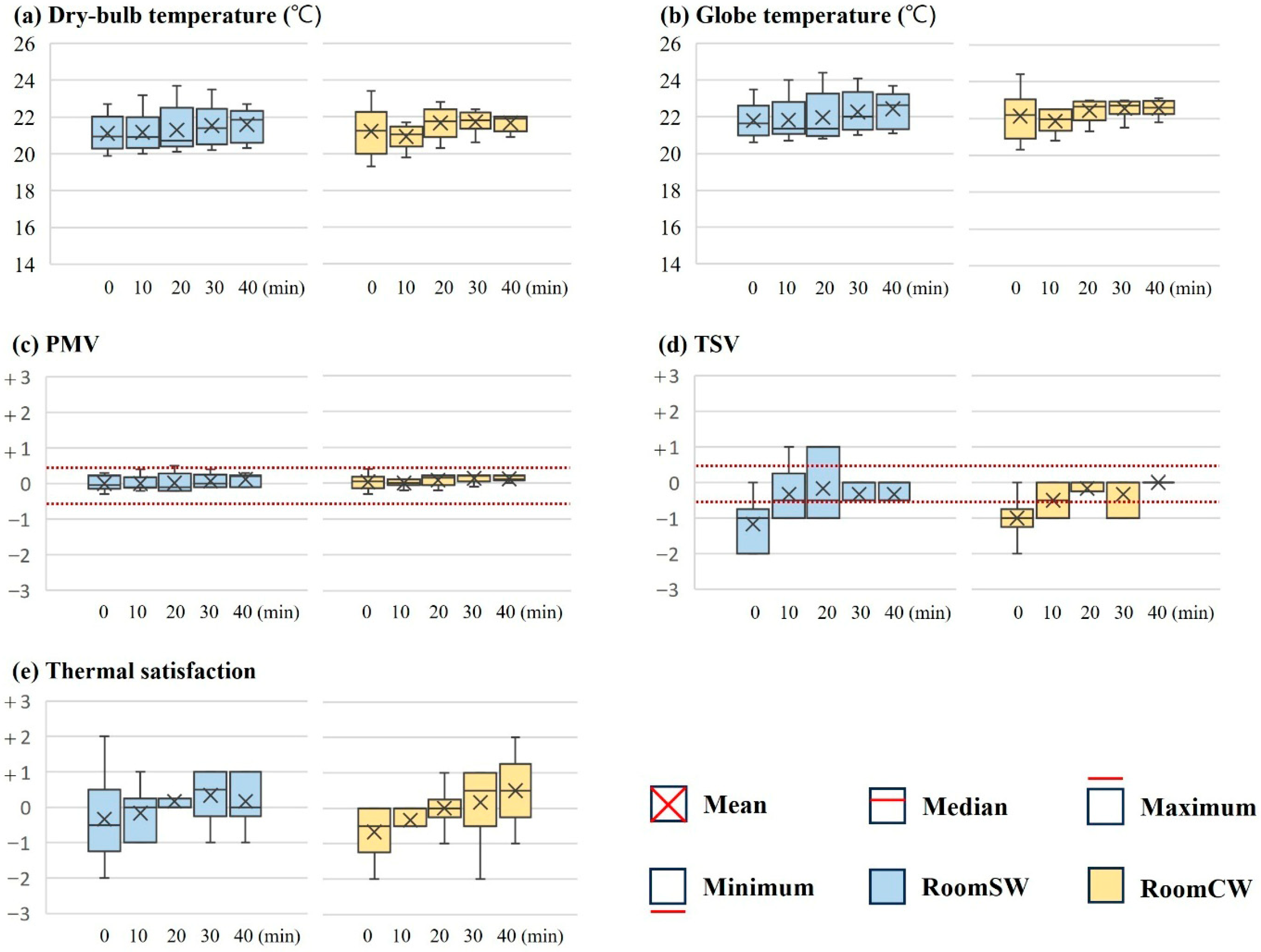 On the three clear days analyzed (10, 17, and 24 December), the average tinting level of the smart window during the survey period (12:00–15:00) was level 8 (Figure 9), and Figure 10 shows the temperature indices over the 40 min survey period. The dry bulb temperatures in the RoomSW and RoomCW (Figure 10a) ranged from approximately 19 °C to 24 °C, and the globe temperature (Figure 10b) ranged from 20 °C to 25 °C. Prior to the experiment, the indoor temperature range corresponding to the PMV within ±0.5 was identified and used to set the target temperature. The heaters were operated such that they switched off automatically upon reaching the setpoint and switched on again when the temperature fell below it. As a result, the dry bulb and globe temperatures varied within a certain range, and the mean dry bulb and globe temperatures during the survey period were 21.4 °C and 22.3 °C, respectively, in the RoomSW and 21.3 °C and 22.1 °C, respectively, in the RoomCW. Statistical analysis revealed that the differences in dry bulb and globe temperatures between the two rooms were not statistically significant, and the effect sizes were very small, indicating a minimal difference (Table 11).