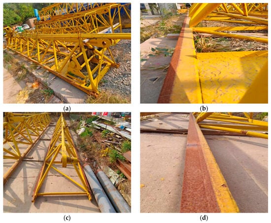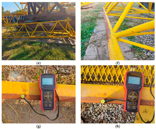 Field photographs of the jib with different jib segments. (a,b) The overall view and wear details of the b01 segment; (c,d) the overall view and wear details of the b03 segment; (e,f) the overall view and wear details of the b06 segment; (g,h) the measurement process.