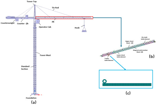 Finite element mesh model (a) tower crane global model; (b) detailed model of the jib; (c) detailed contact model between the wheel and the jib.