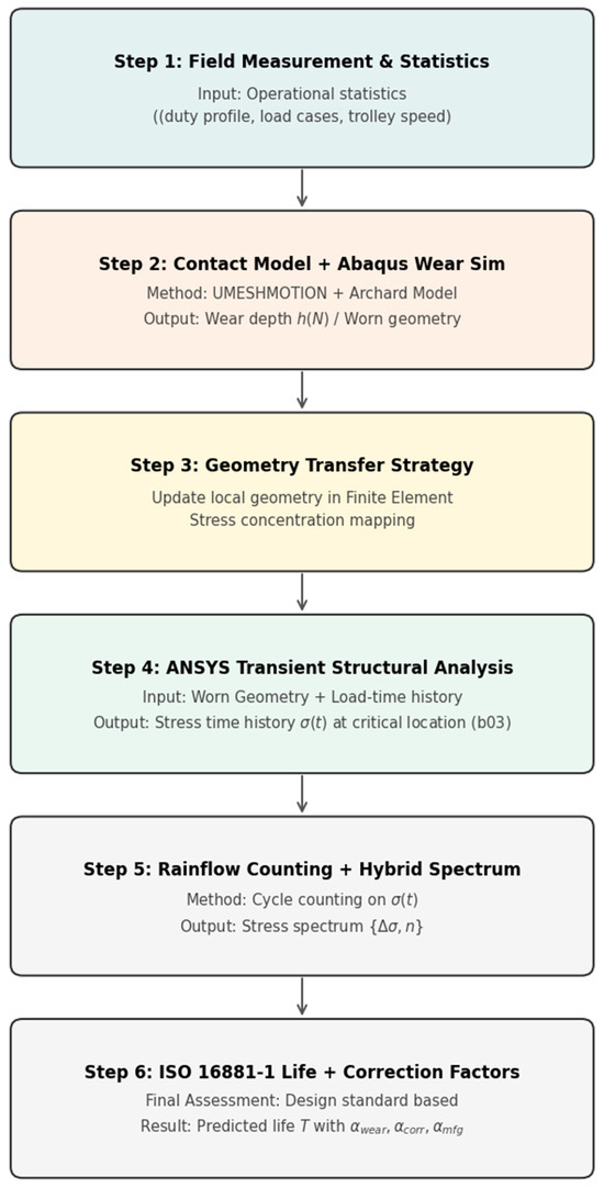 Based on wear analysis and operational records, the wear simulation outputs the worn geometry, which is transferred to the structural model to update the local geometry. Under the same duty cycle loading derived from wheel pressures, the updated geometry leads to a modified stress time history that is then used for rainflow counting and life evaluation.
